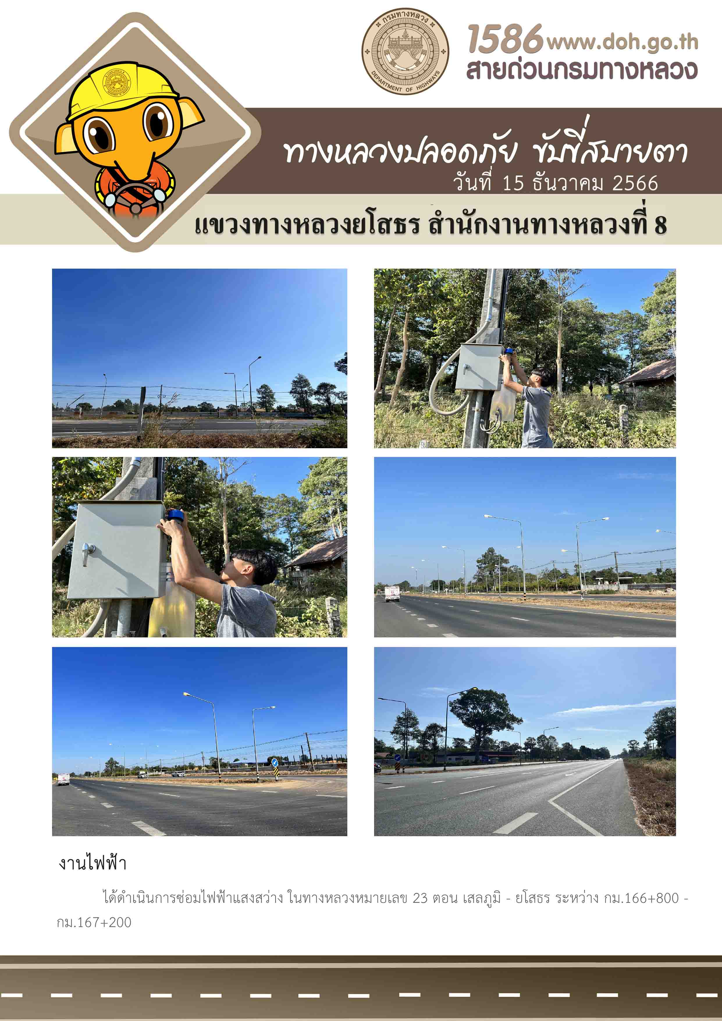 วันที่ 15 ธันวาคม 2566 งานไฟฟ้า ได้ดำเนินการซ่อมไฟฟ้าแสงสว่าง ในทางหลวงหมายเลข 23 ตอน เสลภูมิ - ยโสธร ระหว่าง กม.166+800 - กม.167+200