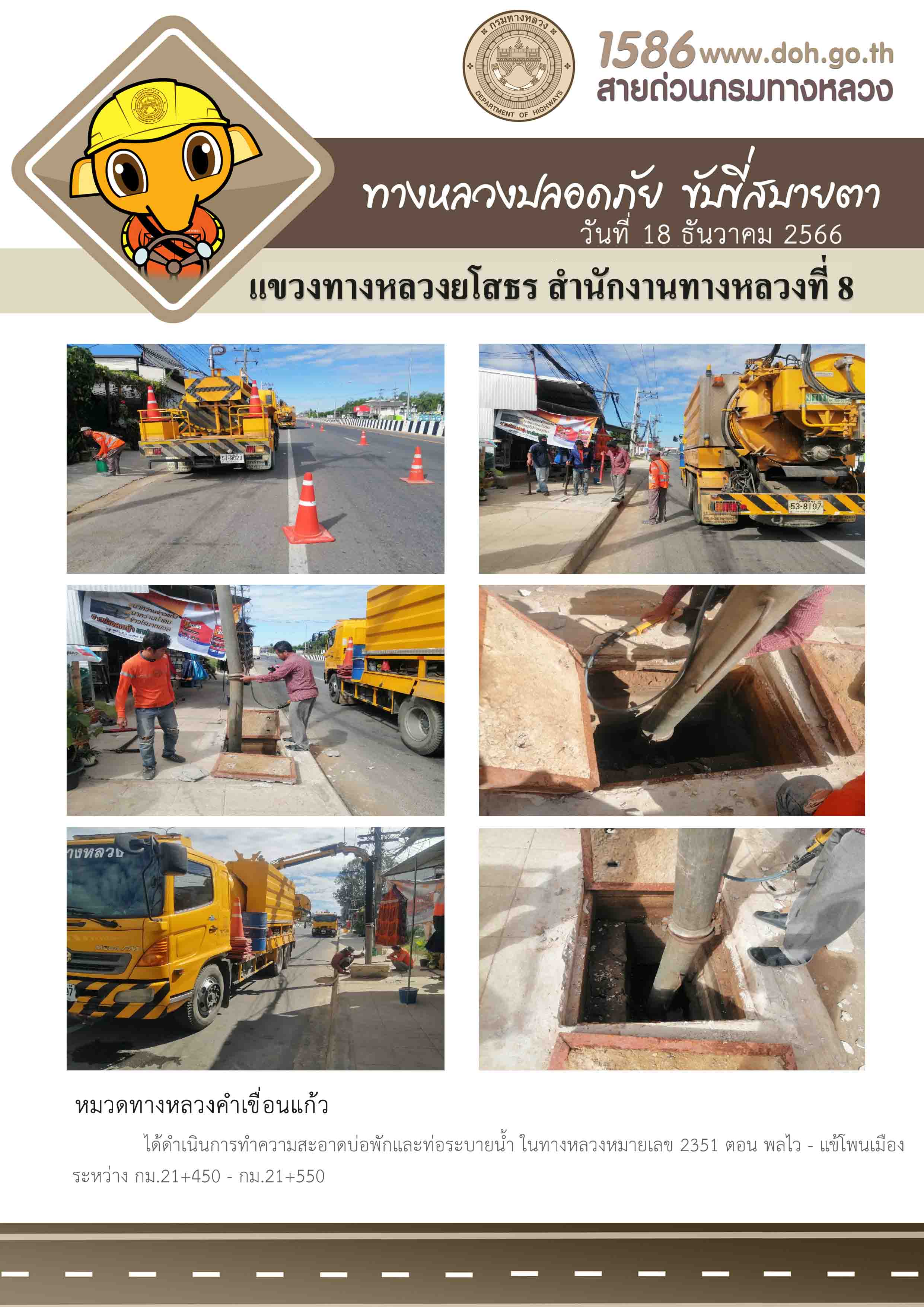 วันที่ 18 ธันวาคม 2566 หมวดทางหลวงคำเขื่อนแก้ว ได้ดำเนินการทำความสะอาดบ่อพักและท่อระบายน้ำ ในทางหลวงหมายเลข 2351 ตอน พลไว - แข้โพนเมือง ระหว่าง กม.21+450 - กม.21+550