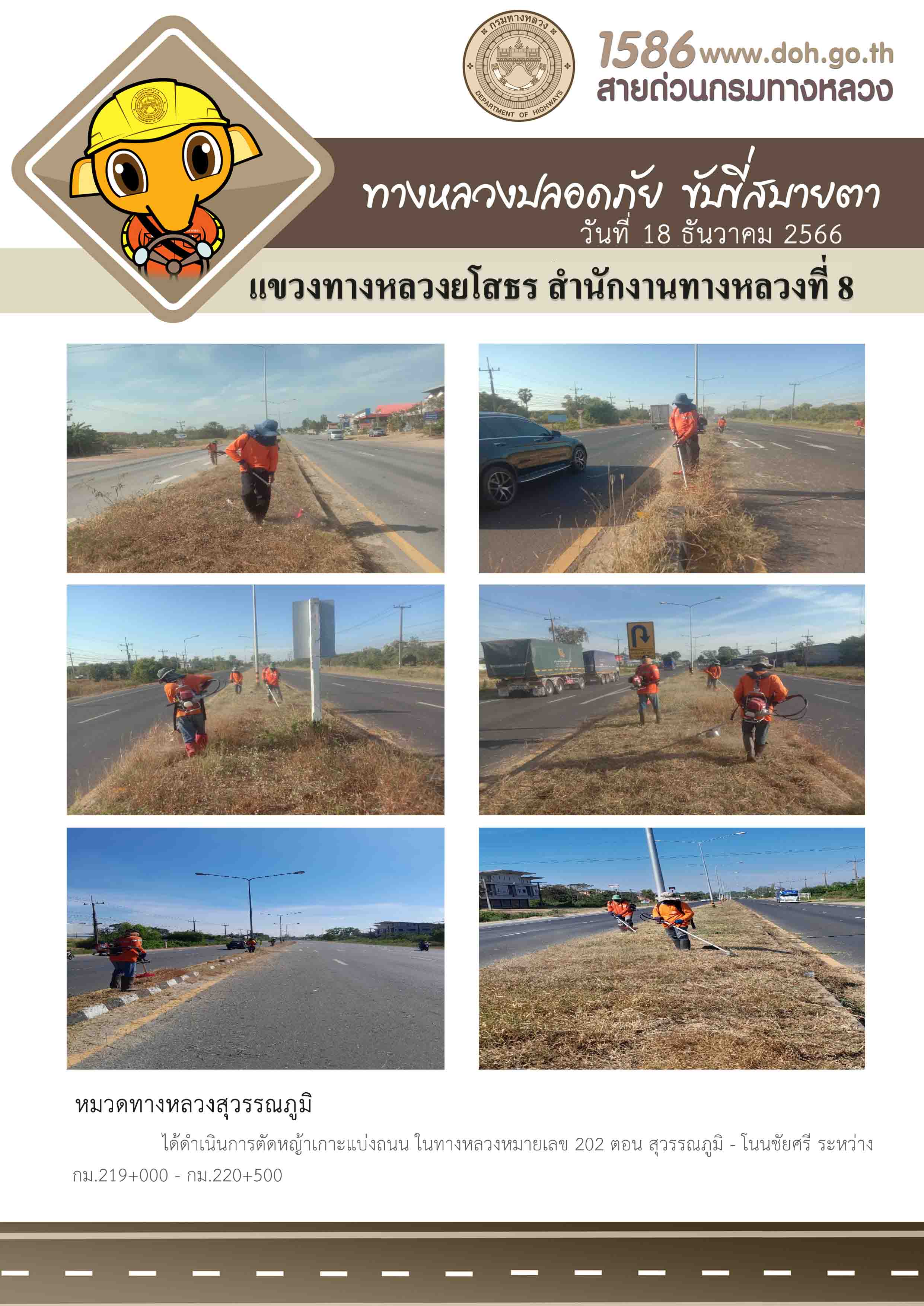 วันที่ 18 ธันวาคม 2566 หมวดทางหลวงสุวรรณภูมิ ได้ดำเนินการตัดหญ้าเกาะแบ่งถนน ในทางหลวงหมายเลข 202 ตอน สุวรรณภูมิ - โนนชัยศรี ระหว่าง กม.219+000 - กม.220+500