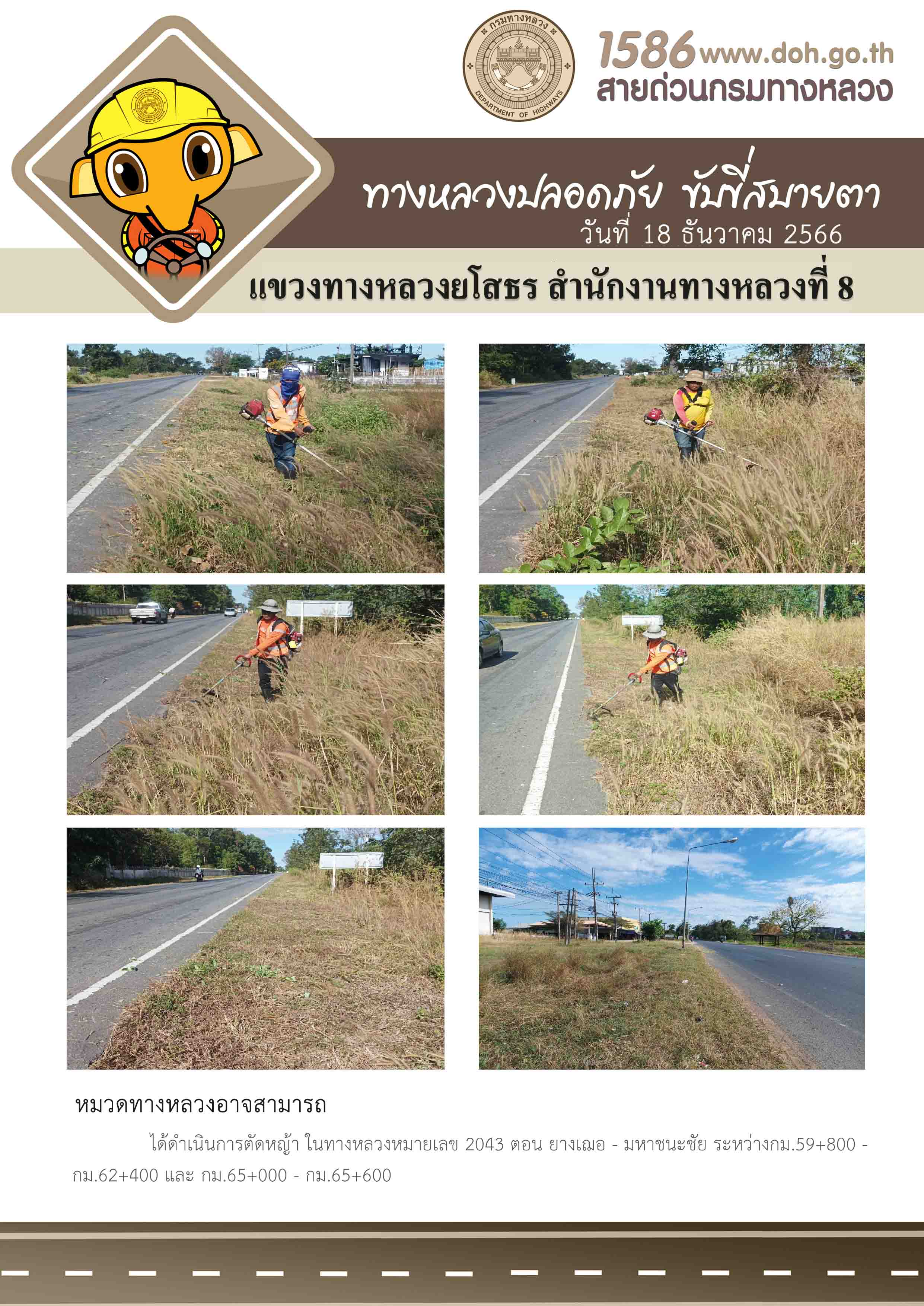 วันที่ 18 ธันวาคม 2566 หมวดทางหลวงอาจสามารถ ได้ดำเนินการตัดหญ้า ในทางหลวงหมายเลข 2043 ตอน ยางเฌอ - มหาชนะชัย ระหว่าง กม.59+800 - กม.62+400 และ กม.65+000 - กม.65+600