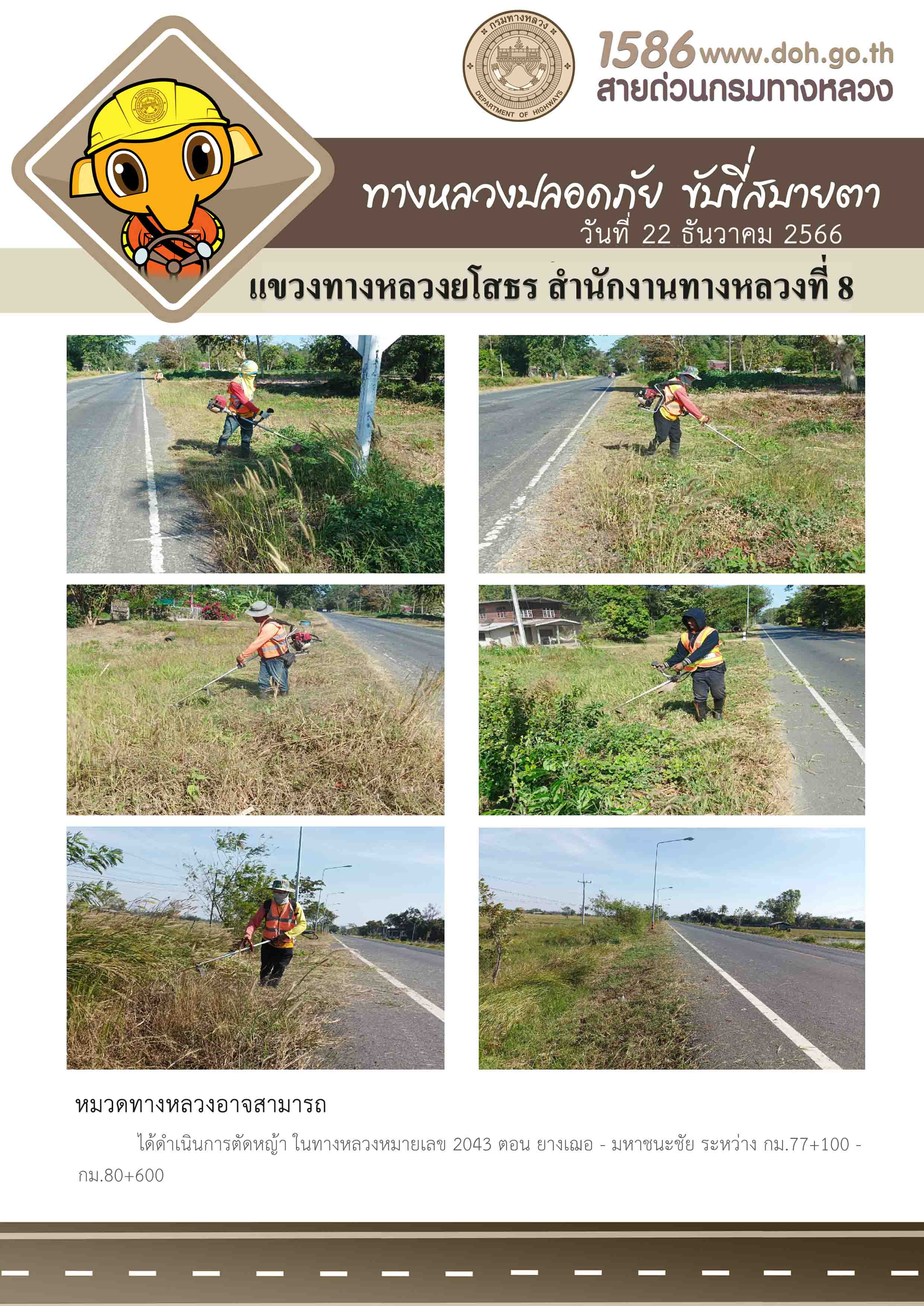 - [11:56] ทั่วไป วันศุกร์ที่ 10 เมษายน 2569 งานอำนวยความปลอดภัย ได้ดำเนินการตัดหญ้า, ทำความสะอาดในบริเวณแขวงทางหลวงยโสธร
