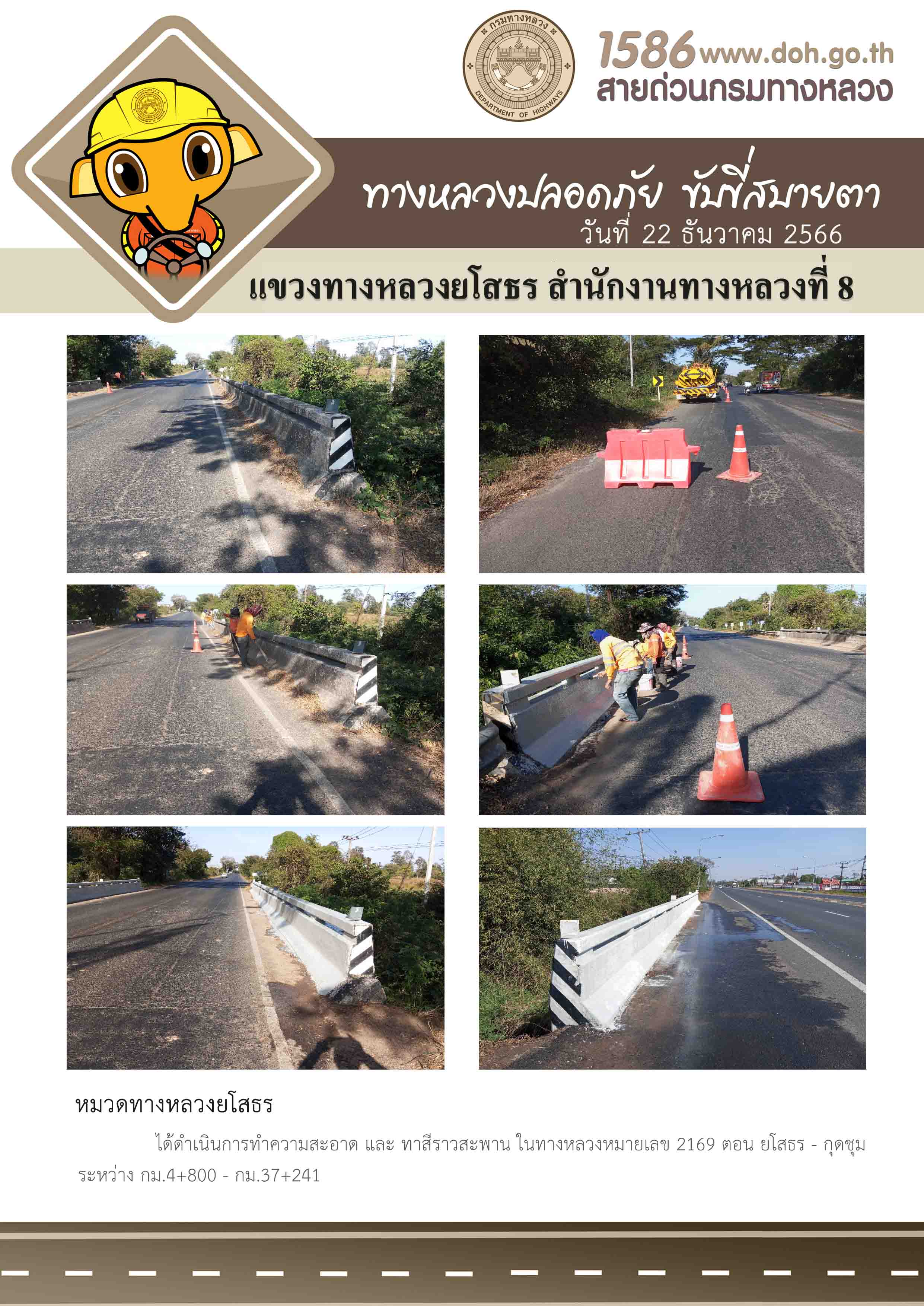 วันที่ 22 ธันวาคม 2566 หมวดทางหลวงยโสธร ได้ดำเนินการทำความสะอาด และทาสีราวสะพาน ในทางหลวงหมายเลข 2169 ตอน ยโสธร - กุดชุม ระหว่าง กม.4+800 - กม.37+241