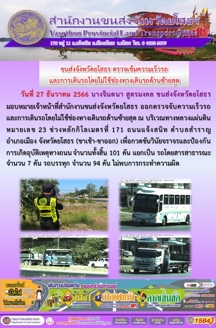 วันที่ 27 ธันวาคม 2566 เจ้าหน้าที่สำนักงานขนส่งจังหวัดยโสธร ออกตั้งจุดตรวจจับความเร็ว