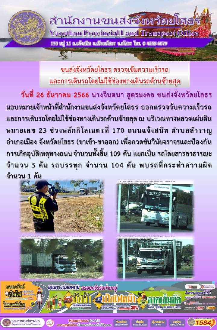 วันที่ 28 ธันวาคม 2566 เจ้าหน้าที่สำนักงานขนส่งจังหวัดยโสธร ออกตั้งจุดตรวจจับความเร็ว
