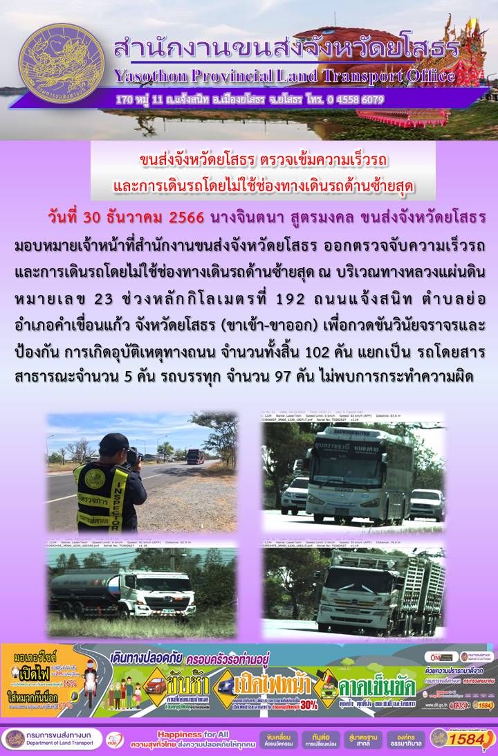 วันที่ 30 ธันวาคม 2566 เจ้าหน้าที่สำนักงานขนส่งจังหวัดยโสธร ออกตั้งจุดตรวจจับความเร็ว