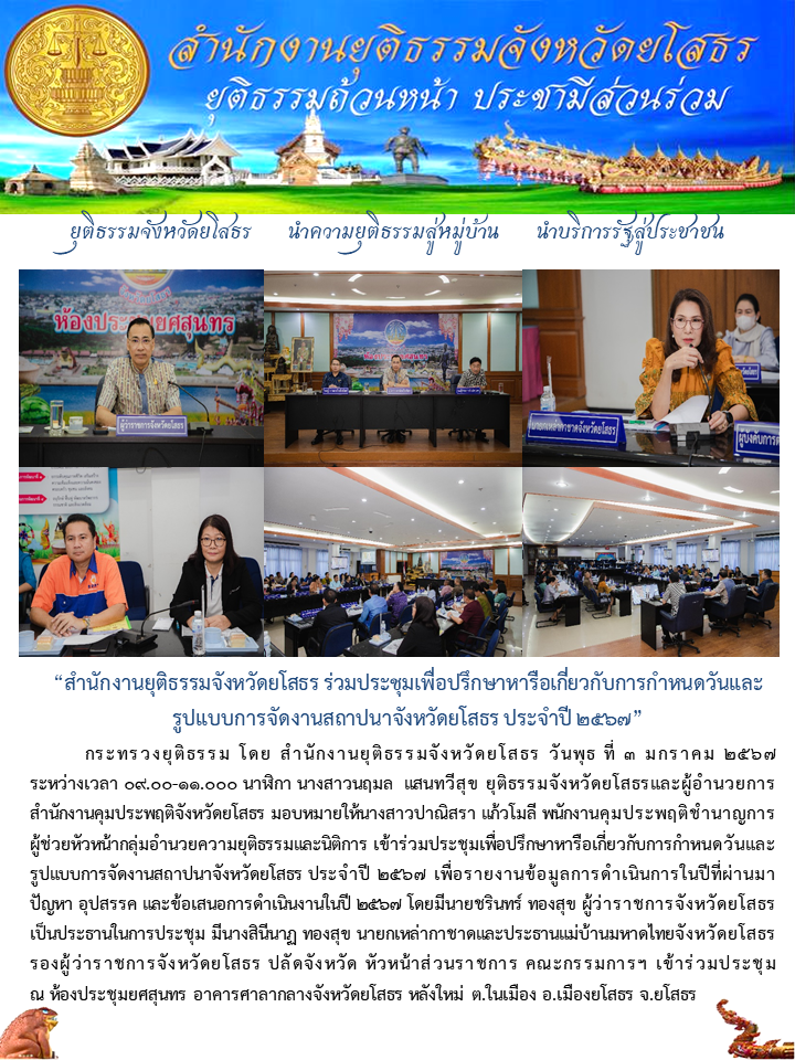 สำนักงานยุติธรรมจังหวัดยโสธร ร่วมประชุมเพื่อปรึกษาหารือเกี่ยวกับการกำหนดวันและรูปแบบการจัดงานสถาปนาจังหวัดยโสธร ประจำปี 2567