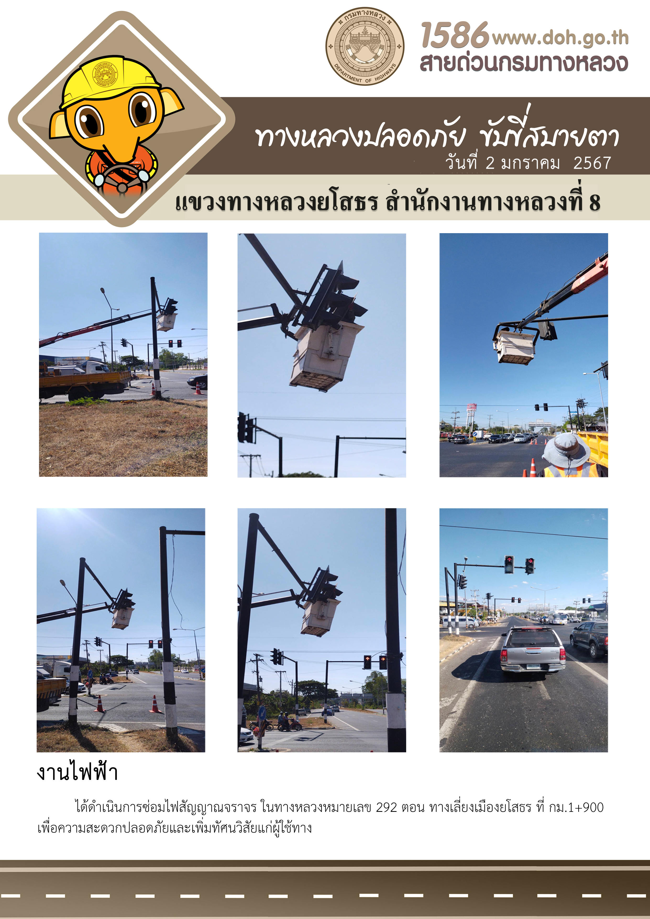 วันที่ 2 มกราคม 2567 งานไฟฟ้า ได้ดำเนินการซ่อมไฟสัญญาณจราจร ในทางหลวงหมายเลข 292 ตอน ทางเลี่ยงเมืองยโสธร ที่ กม.1+900 เพื่อความสะดวกปลอดภัยและเพิ่มทัศนวิสัยแก่ผู้ใช้ทาง
