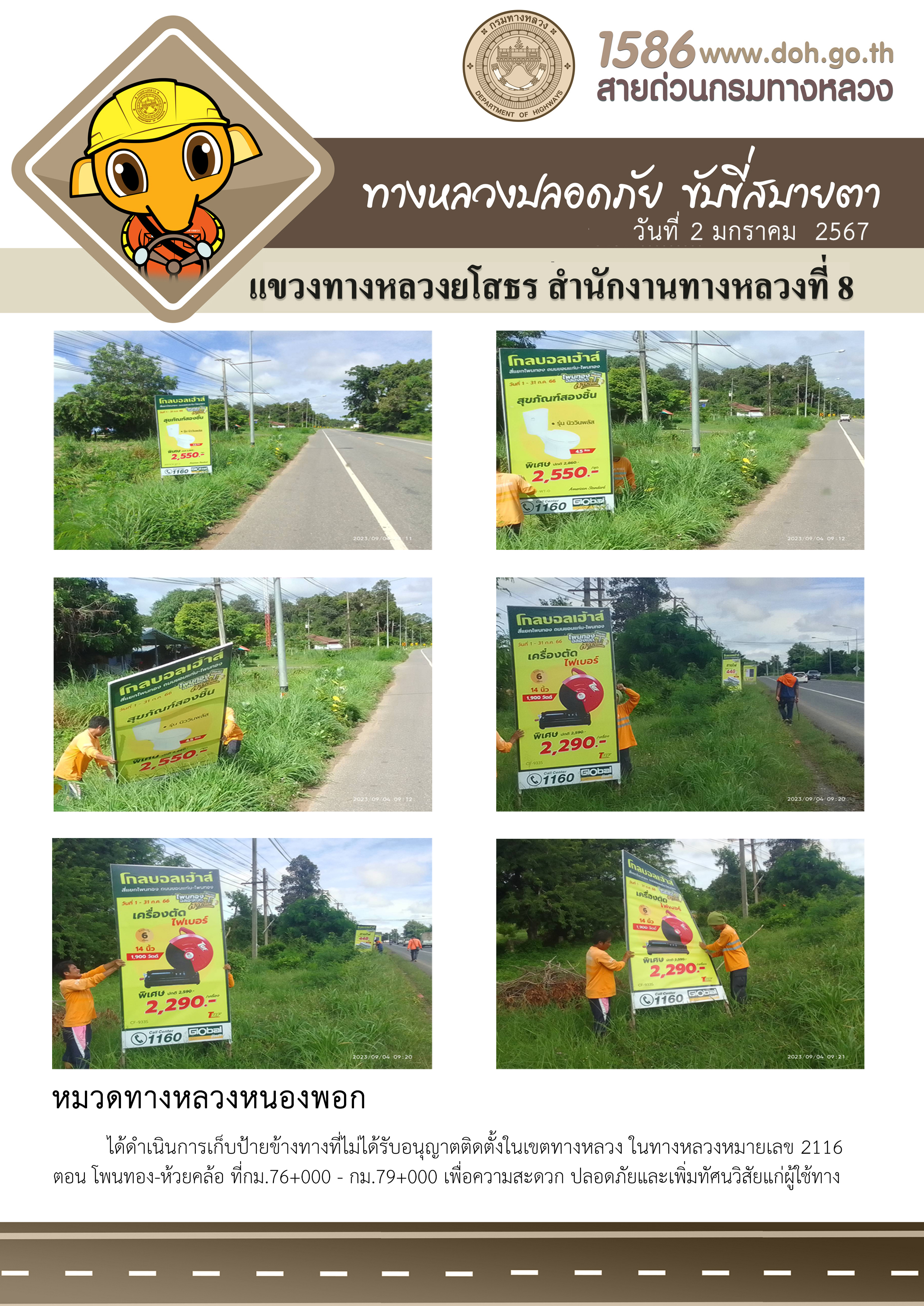 วันที่ 2 มกราคม 2567 หมวดทางหลวงหนองพอก ได้ดำเนินการเก็บป้ายข้างทางที่ไม่ได้รับอนุญาตติดตั้งในเขตทางหลวง ในทางหลวงหมายเลข 2116 ตอน โพนทอง-ห้วยคล้อ ที่ กม.76+000 - กม.79+000 เพื่อความสะดวก ปลอดภัยและเพิ่มทัศนวิสัยแก่ผู้ใช้ทาง