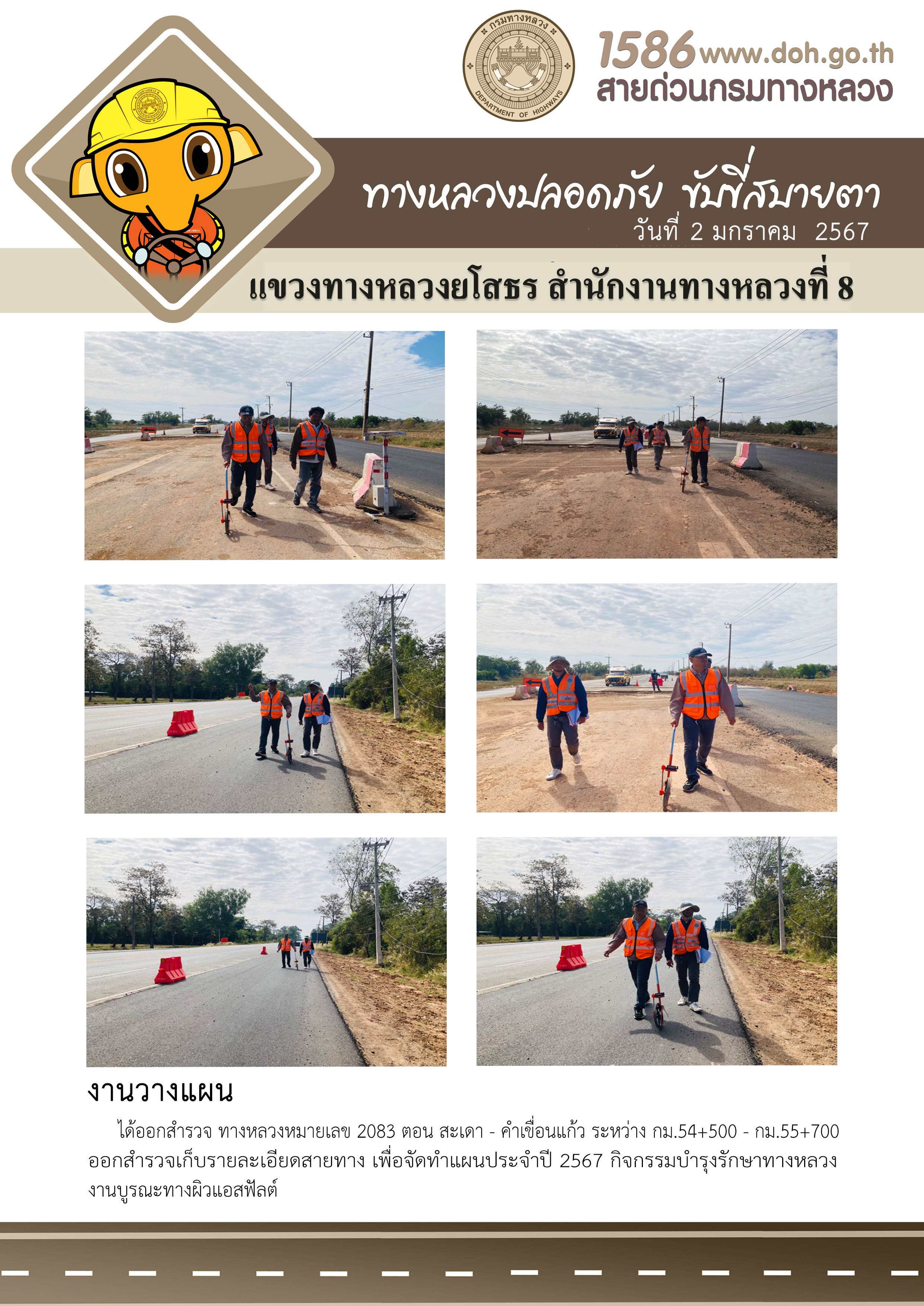 วันที่ 2 มกราคม 2567 งานวางแผน ได้ออกสำรวจ ทางหลวงหมายเลข 2083 ตอน สะเดา - คำเขื่อนแก้ว ระหว่าง กม.54+500 - กม.55+700 ออกสำรวจเก็บรายละเอียดสายทาง เพื่อจัดทำแผนประจำปี 2567 กิจกรรมบำรุงรักษาทางหลวง งานบูรณะทางผิวแอสฟัลต์