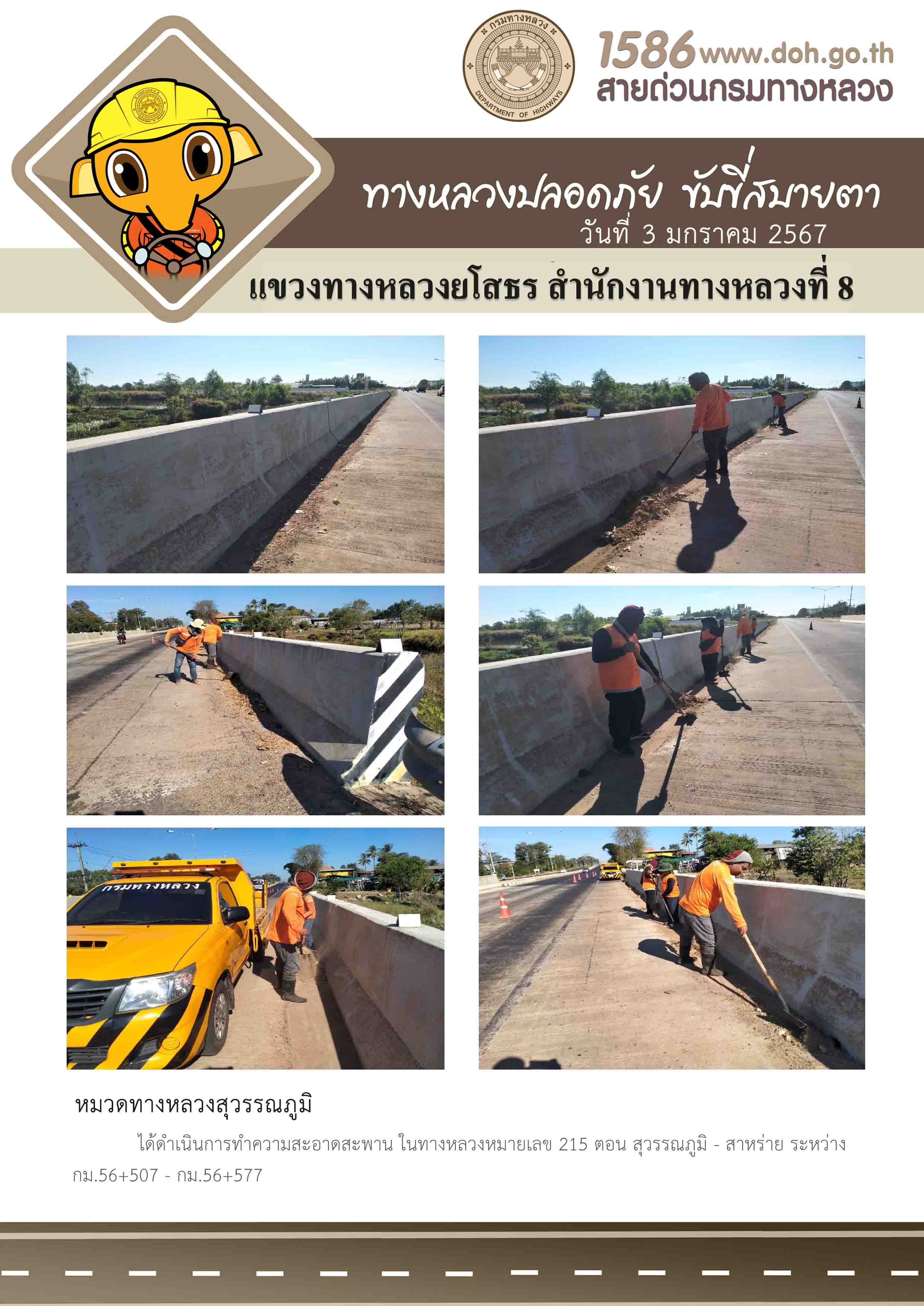 วันที่ 3 มกราคม 2567 หมวดทางหลวงสุวรรณภูมิ ได้ดำเนินการทำความสะอาดสะพาน ในทางหลวงหมายเลข 215 ตอน สุวรรณภูมิ - สาหร่าย ระหว่าง กม.56+507 - กม.56+577