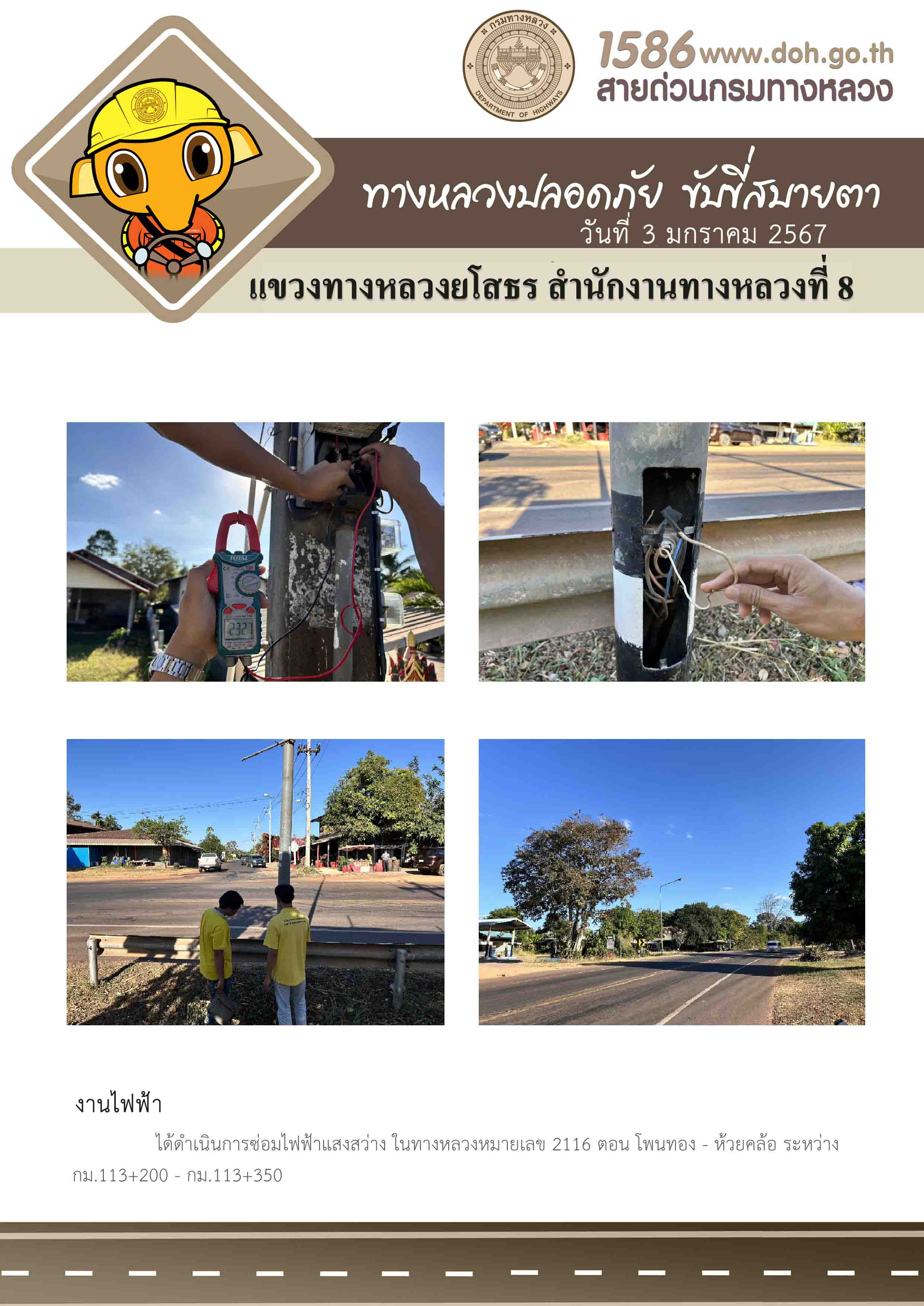วันที่ 3 มกราคม 2567 งานไฟฟ้า ได้ดำเนินการซ่อมไฟฟ้าแสงสว่าง ในทางหลวงหมายเลข 2116 ตอน โพนทอง - ห้วยคล้อ ระหว่าง กม.113+200 - กม.113+350