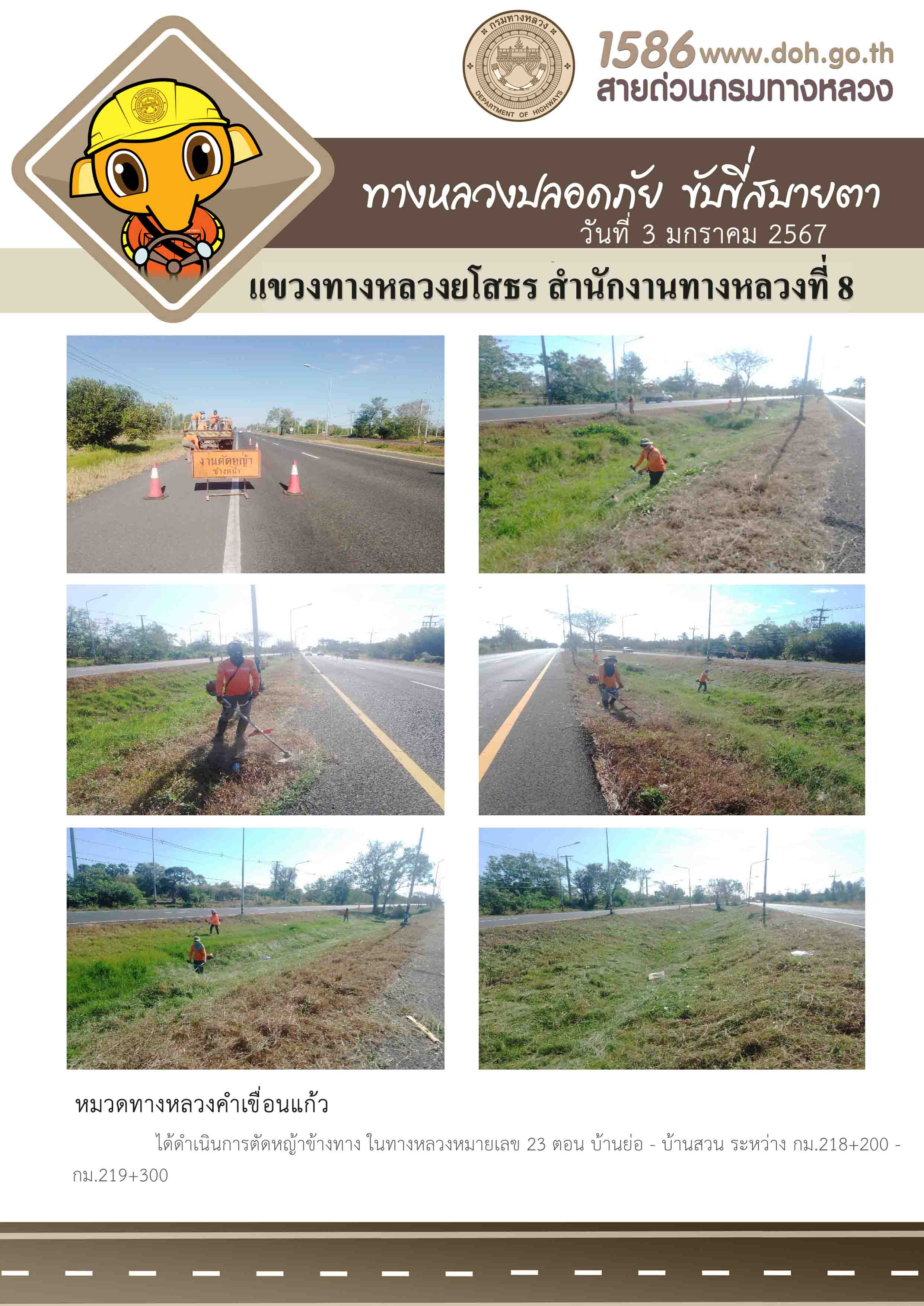 วันที่ 3 มกราคม 2567 หมวดทางหลวงคำเขื่อนแก้ว ได้ดำเนินการตัดหญ้าข้างทาง ในทางหลวงหมายเลข 23 ตอน บ้านย่อ - บ้านสวน ระหว่าง กม.218+200 - กม.219+300