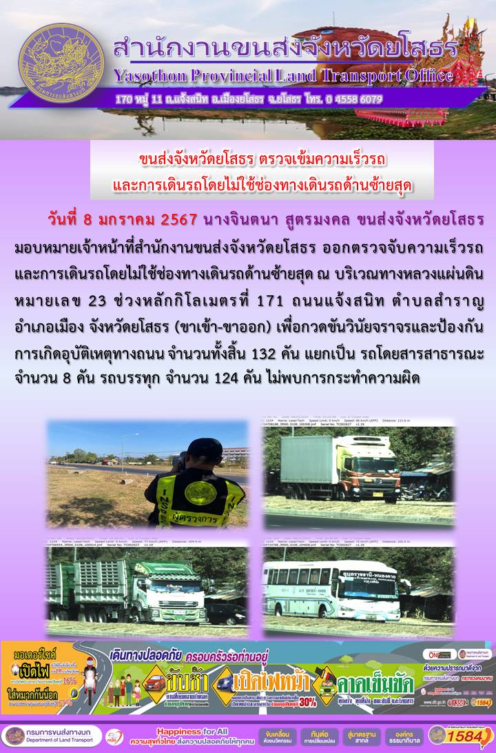 วันที่ 8 มกราคม 2567 เจ้าหน้าที่สำนักงานขนส่งจังหวัดยโสธร ออกตั้งจุดตรวจจับความเร็ว