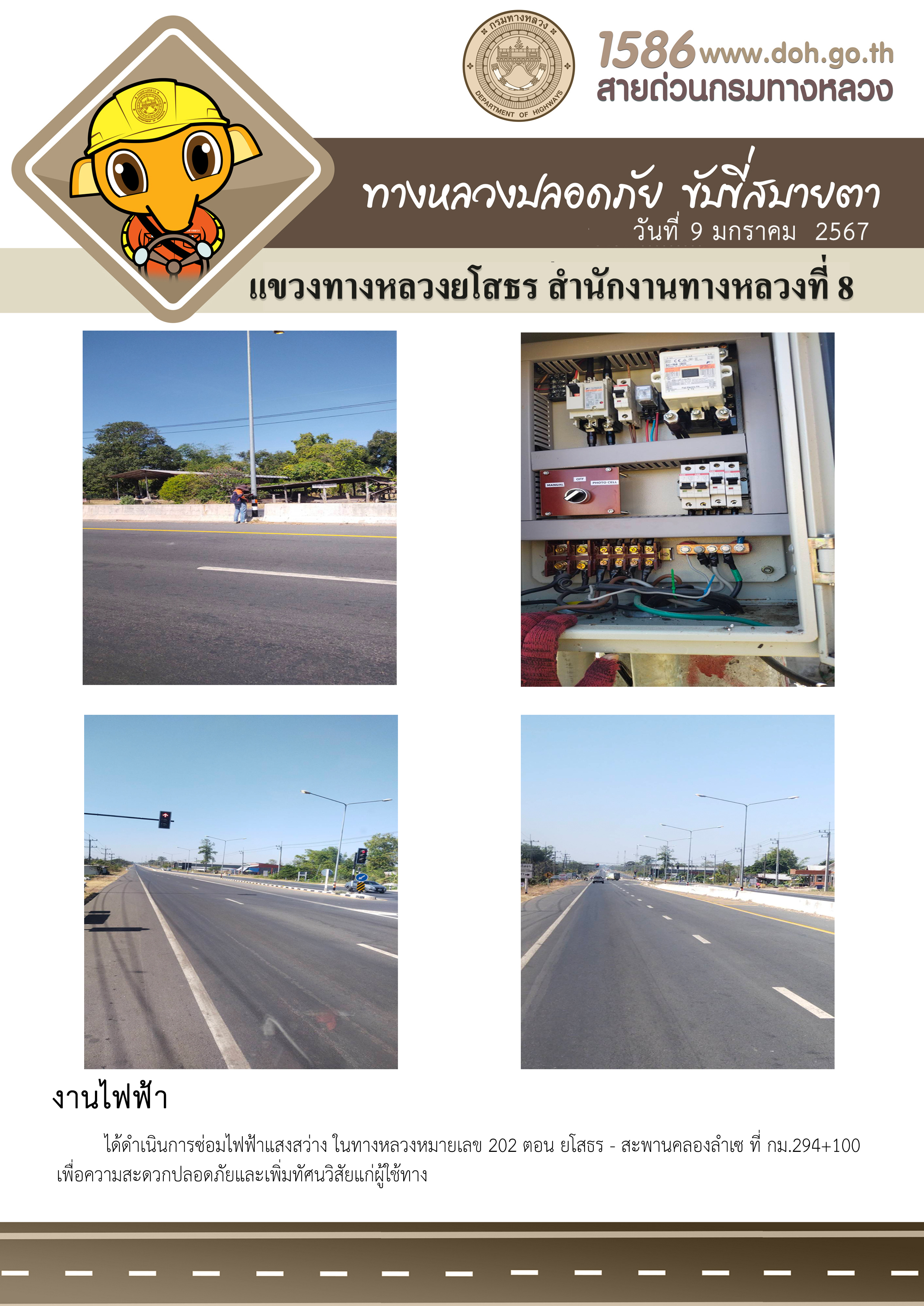 วันที่ 9 มกราคม 2567 งานไฟฟ้า ได้ดำเนินการซ่อมไฟฟ้าแสงสว่าง ในทางหลวงหมายเลข 202 ตอน ยโสธร - สะพานคลองลำเซ ที่ กม.294+100 เพื่อความสะดวกปลอดภัยและเพิ่มทัศนวิสัยแก่ผู้ใช้ทาง
