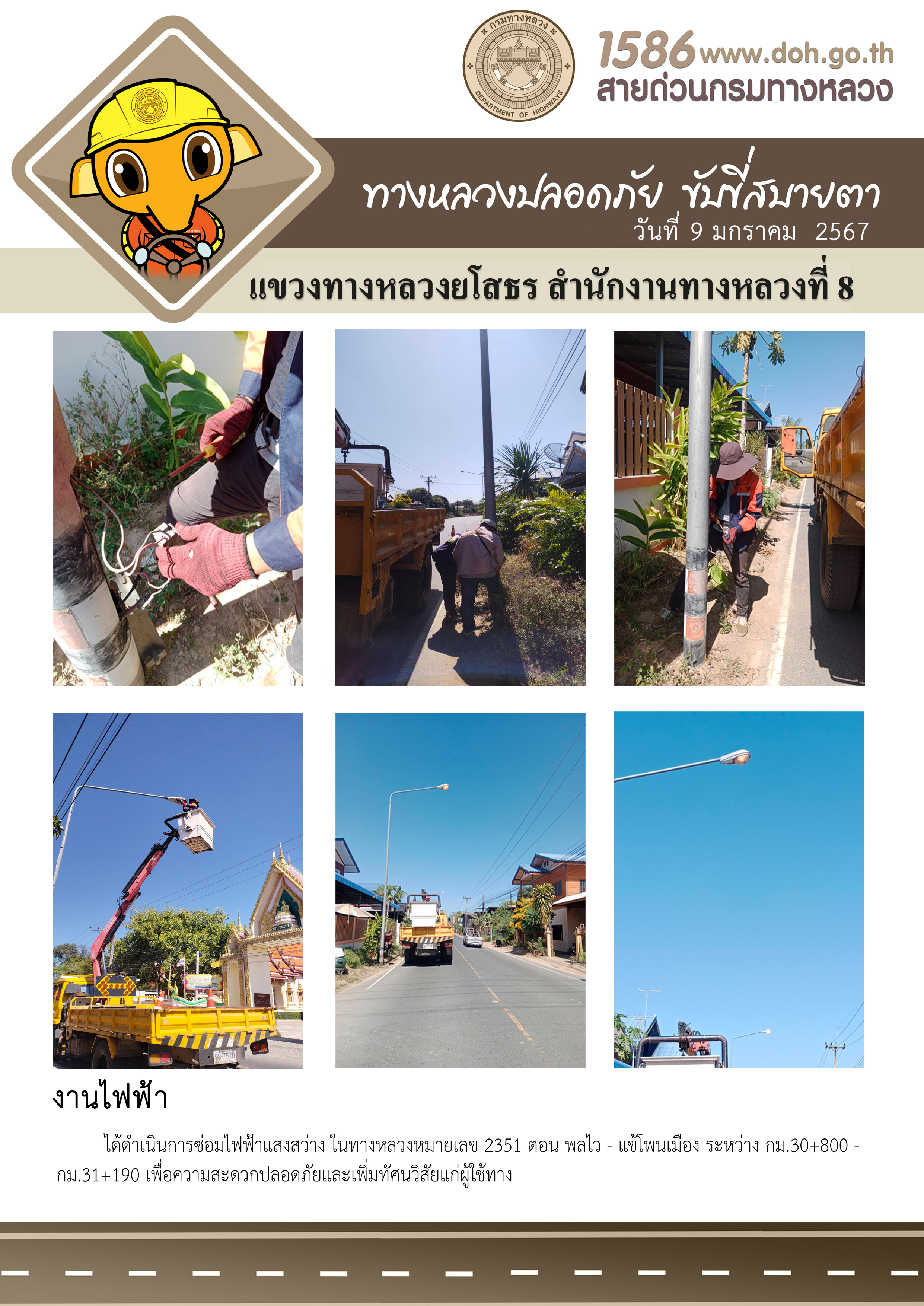 วันที่ 9 มกราคม 2567 งานไฟฟ้า ได้ดำเนินการซ่อมไฟฟ้าแสงสว่าง ในทางหลวงหมายเลข 2351 ตอน พลไว - แข้โพนเมือง ระหว่าง กม.30+800 - กม.31+190 เพื่อความสะดวกปลอดภัยและเพิ่มทัศนวิสัยแก่ผู้ใช้ทาง