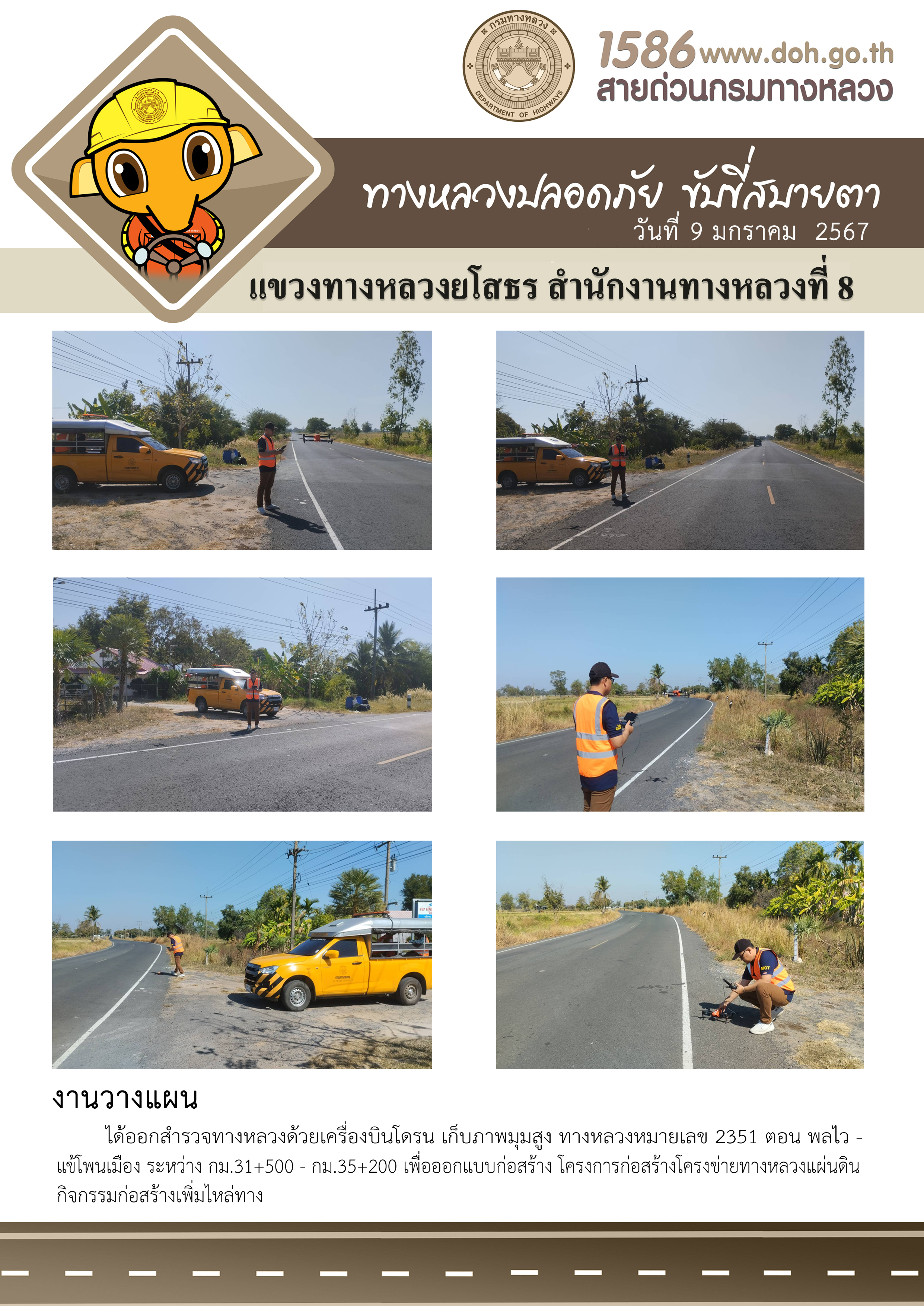 วันที่ 9 มกราคม 2567 งานวางแผน ได้ออกสำรวจทางหลวงด้วยเครื่องบินโดรน เก็บภาพมุมสูง ทางหลวงหมายเลข 2351 ตอน พลไว - แข้โพนเมือง ระหว่าง กม.31+500 - กม.35+200 เพื่อออกแบบก่อสร้าง โครงการก่อสร้างโครงข่ายทางหลวงแผ่นดิน กิจกรรมก่อสร้างเพิ่มไหล่ทาง