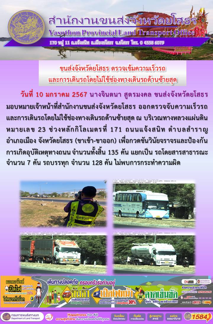 วันที่ 10 มกราคม 2567 เจ้าหน้าที่สำนักงานขนส่งจังหวัดยโสธร ออกตั้งจุดตรวจจับความเร็ว