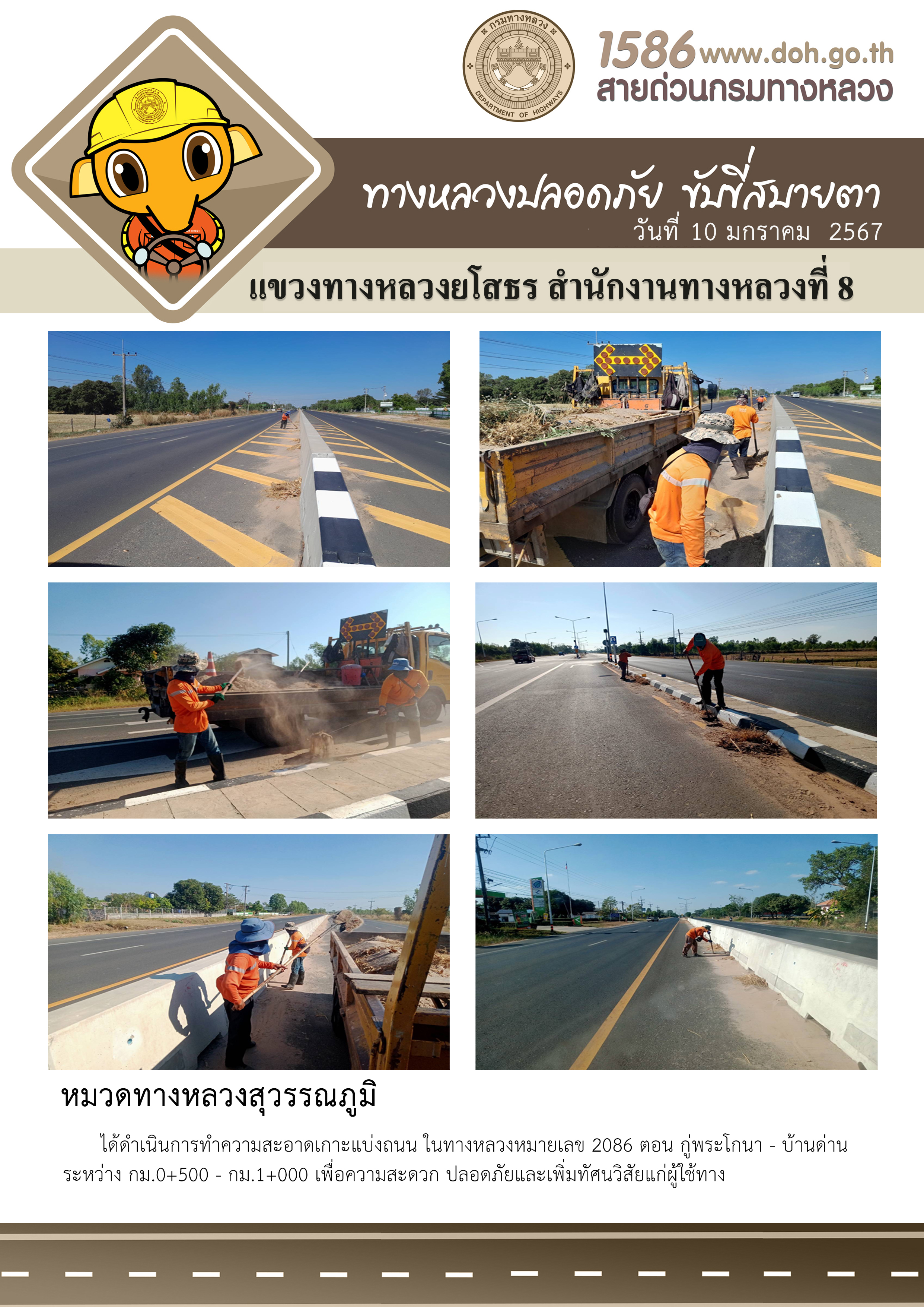 วันที่ 10 มกราคม 2567 หมวดทางหลวงสุวรรณภูมิ ได้ดำเนินการทำความสะอาดเกาะแบ่งถนน ในทางหลวงหมายเลข 2086 ตอน กู่พระโกนา - บ้านด่าน ระหว่าง กม.0+500 - กม.1+000 เพื่อความสะดวก ปลอดภัยและเพิ่มทัศนวิสัยแก่ผู้ใช้ทาง
