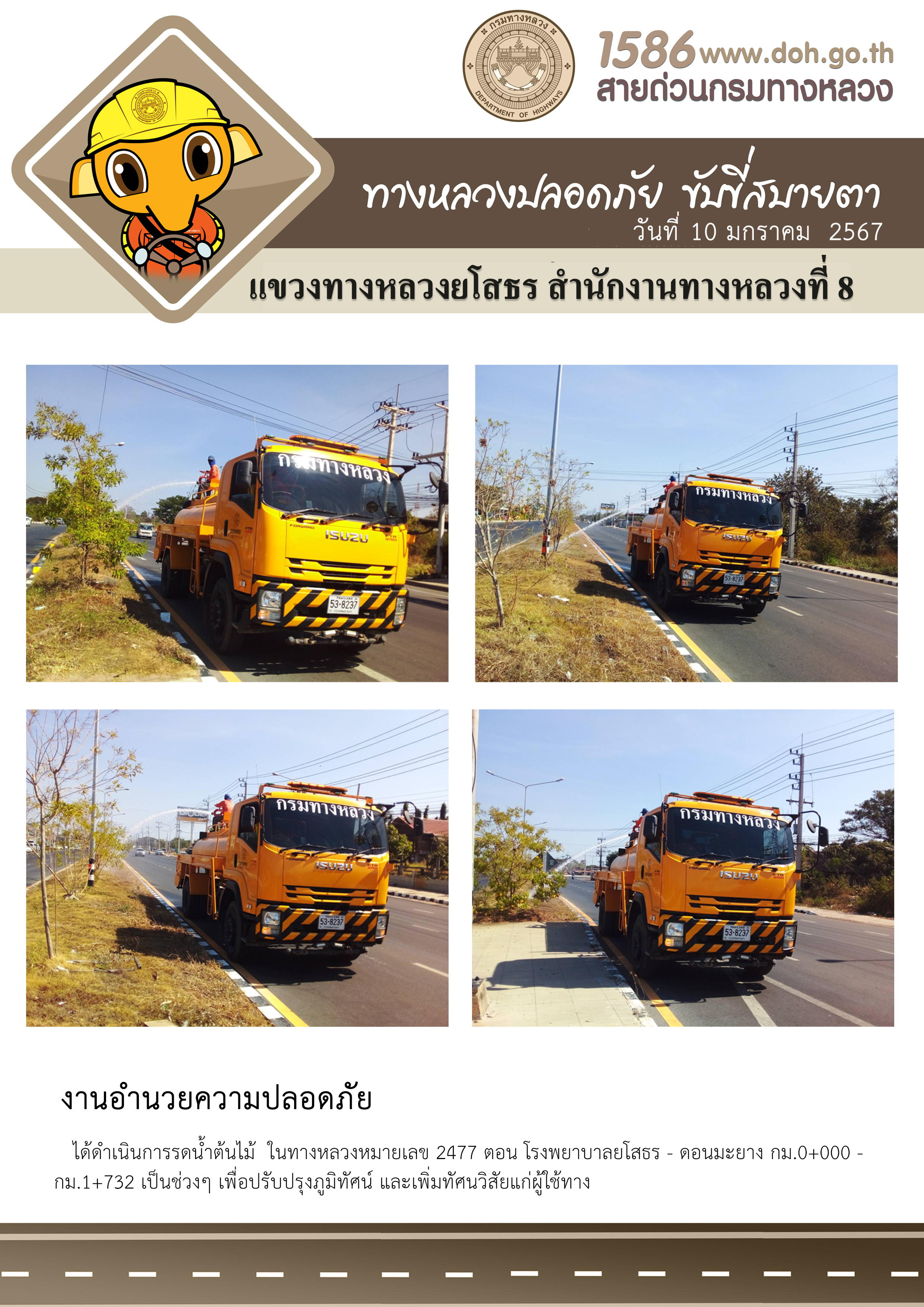 วันที่ 10 มกราคม 2567 งานอำนวยความปลอดภัย ได้ดำเนินการรดน้ำต้นไม้ ในทางหลวงหมายเลข 2477 ตอน โรงพยาบาลยโสธร - ดอนมะยาง กม.0+000 - กม.1+732 เป็นช่วงๆ เพื่อปรับปรุงภูมิทัศน์ และเพิ่มทัศนวิสัยแก่ผู้ใช้ทาง