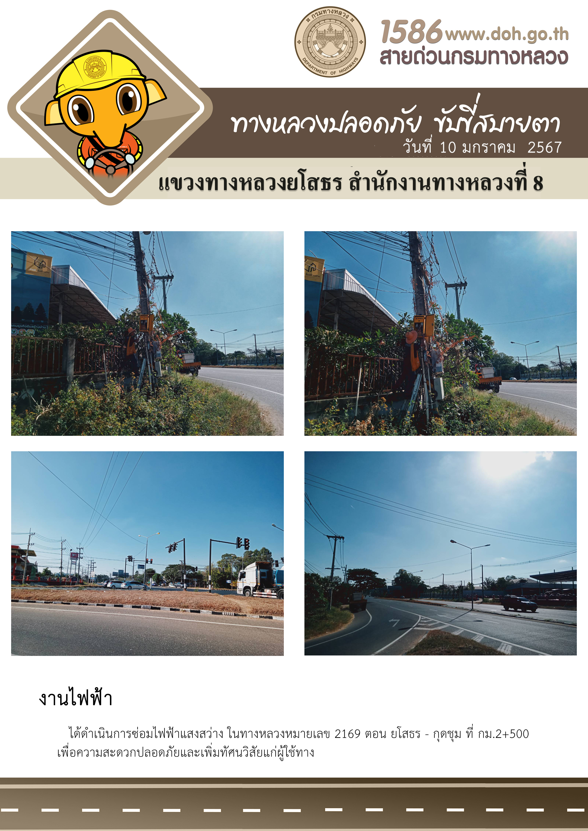 วันที่ 10 มกราคม 2567 งานไฟฟ้า ได้ดำเนินการซ่อมไฟฟ้าแสงสว่าง ในทางหลวงหมายเลข 2169 ตอน ยโสธร - กุดชุม ที่ กม.2+500 เพื่อความสะดวกปลอดภัยและเพิ่มทัศนวิสัยแก่ผู้ใช้ทาง