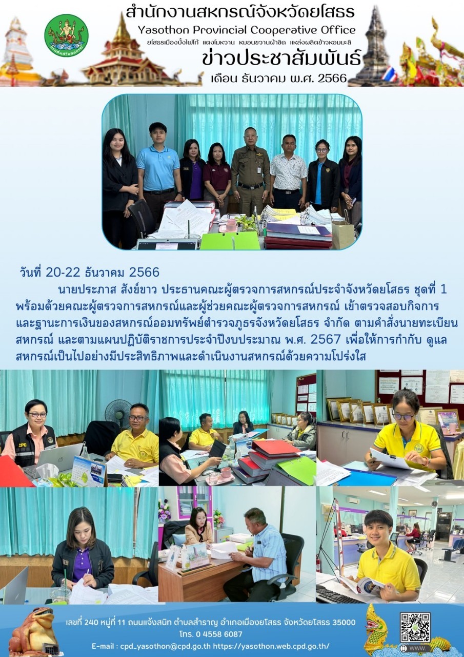 นายประภาส สังข์ขาว ประธานคณะผู้ตรวจการสหกรณ์ประจำจังหวัดยโสธร ชุดที่ 1 พร้อมด้วยคณะผู้ตรวจการสหกรณ์และผู้ช่วยคณะผู้ตรวจการสหกรณ์ เข้าตรวจสอบกิจการ ของสหกรณ์ออมทรัพย์ตำรวจภูธรจังหวัดยโสธร จำกัด