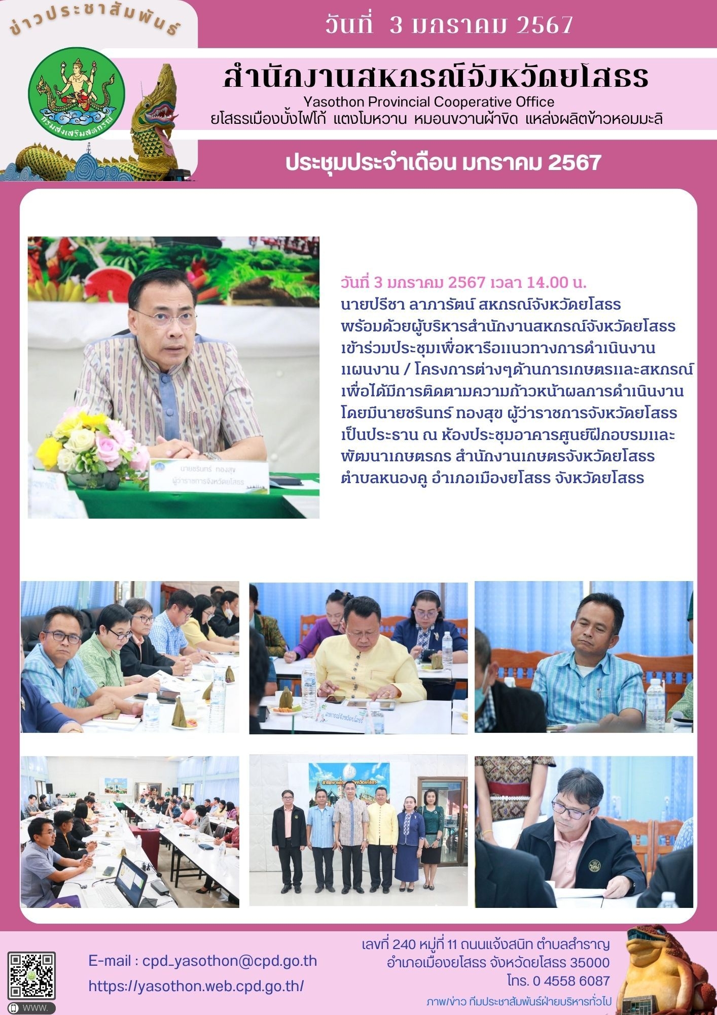 นายปรีชา ลาภารัตน์ สหกรณ์จังหวัดยโสธร พร้อมด้วยผู้บริหารสำนักงานสหกรณ์จังหวัดยโสธร เข้าร่วมประชุมเพื่อหารือแนวทางการดำเนินงานตามแผนงาน/โครงการต่างๆ ณ ห้องประชุมอาคารศูนย์ฝึกอบรมและพัฒนาเกษตรกร สำนักงานเกษตรจังหวัดยโสธร