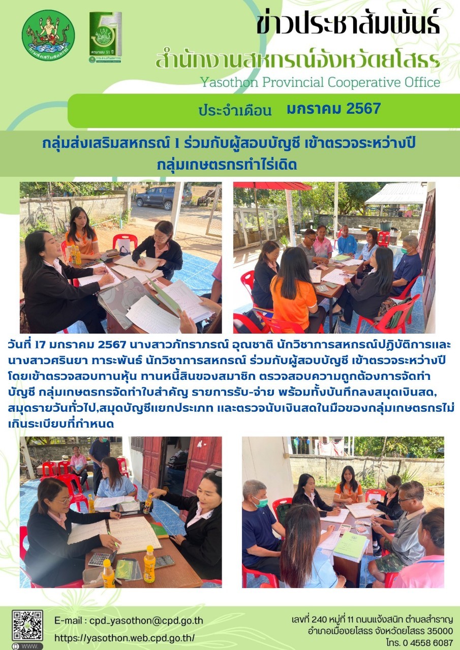 นางสาวภัทราภรณ์ อุณชาติ นักวิชาการสหกรณ์ปฏิบัติการ และเจ้าหน้าที่สำนักงานสหกรณ์จังหวัดยโสธร เข้าตรวจระหว่างปี โดยเข้าตรวจสอบทานหุ้น ทานหนี้สินของสมาชิก ของกลุ่มเกษตรกรทำไร่เดิด