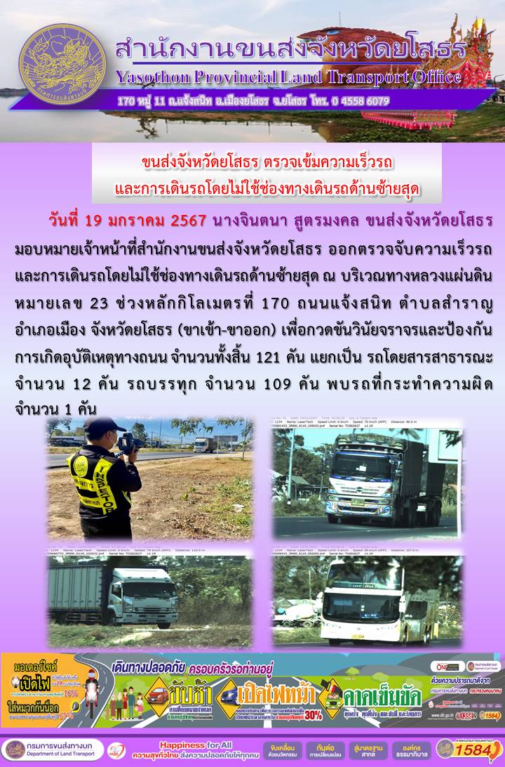 วันที่ 19 มกราคม 2567 เจ้าหน้าที่สำนักงานขนส่งจังหวัดยโสธร ออกตั้งจุดตรวจจับความเร็ว