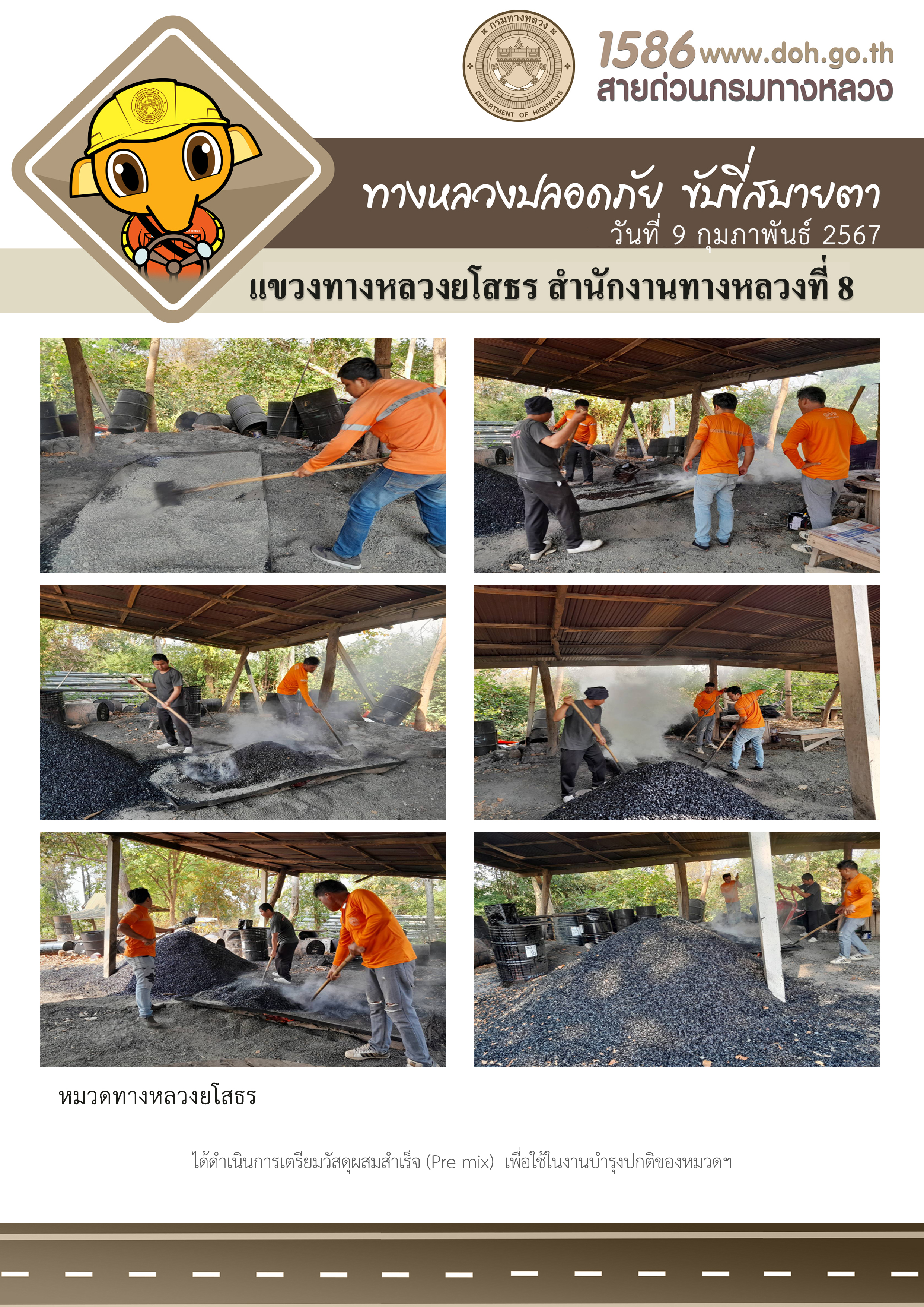 วันที่ 9 กุมภาพันธ์ 2567 หมวดทางหลวงยโสธร ได้ดำเนินการเตรียมวัสดุผสมสำเร็จ (Pre mix) เพื่อใช้ในงานบำรุงปกติของหมวดฯ