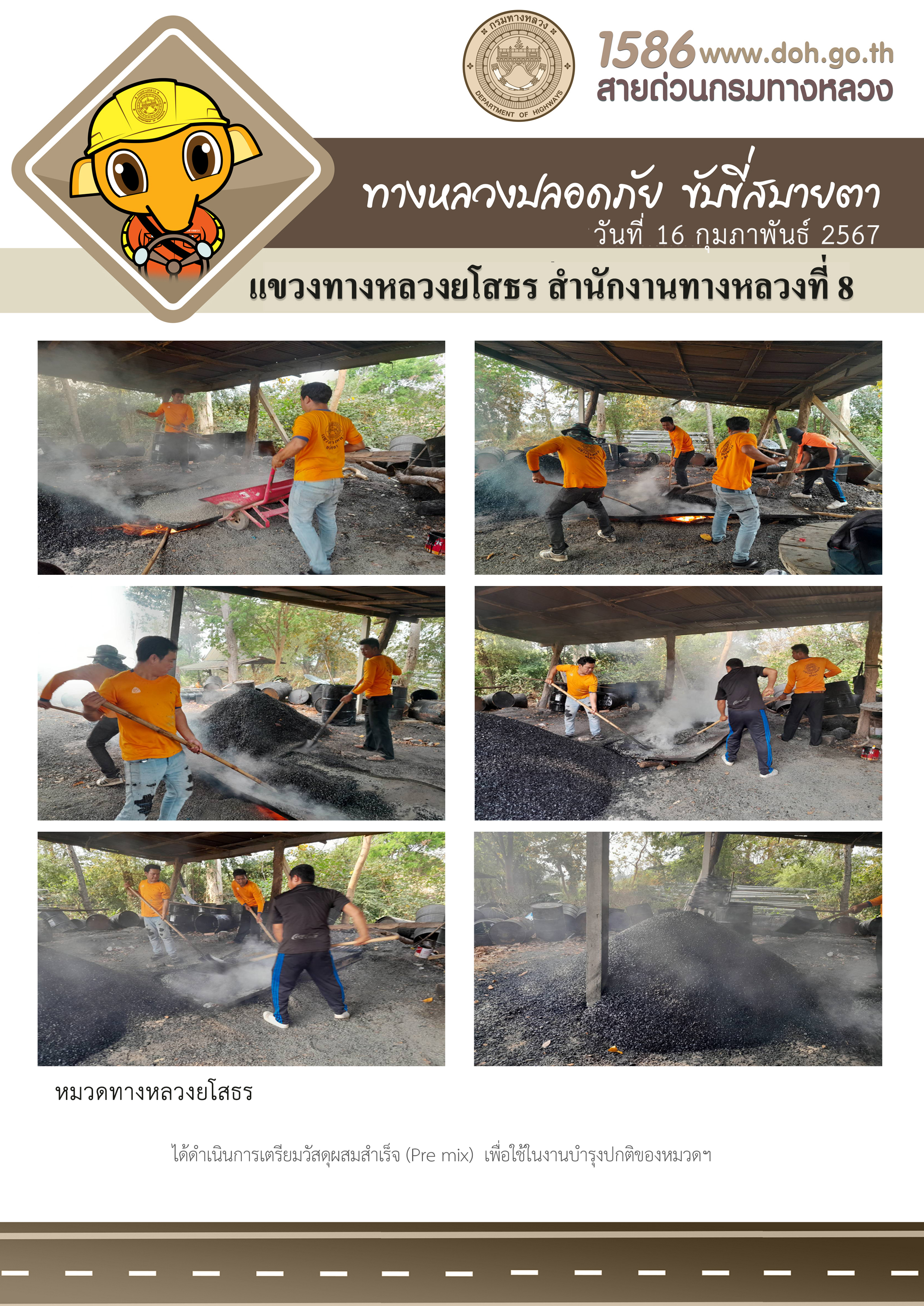 วันที่ 16 กุมภาพันธ์ 2567 หมวดทางหลวงยโสธร ได้ดำเนินการเตรียมวัสดุผสมสำเร็จ (Pre mix) เพื่อใช้ในงานบำรุงปกติของหมวดฯ