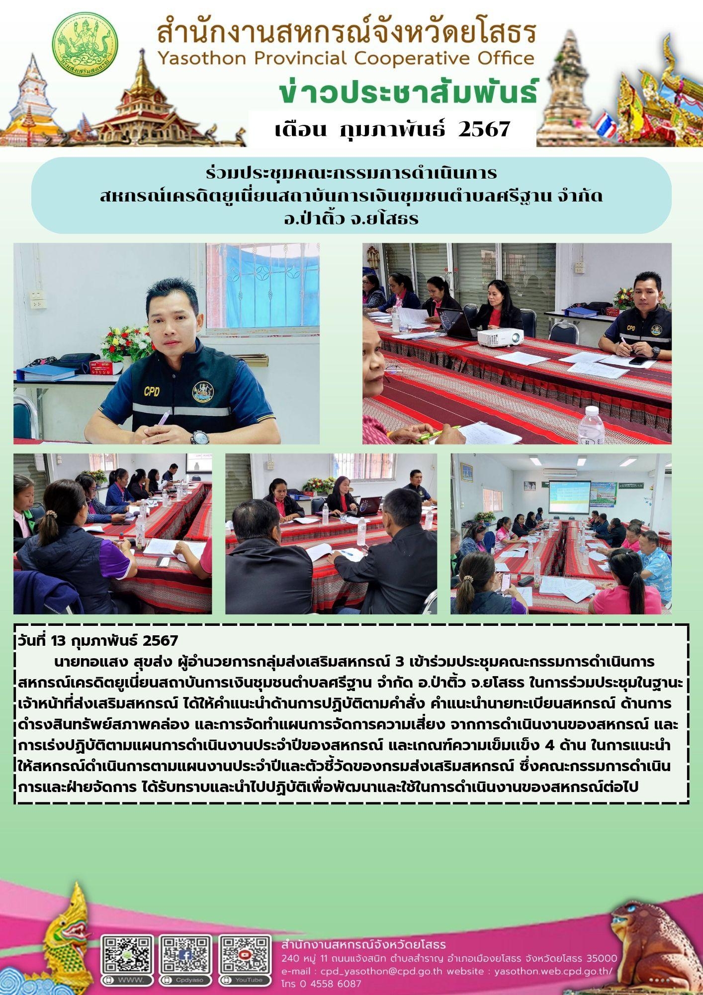 นายทอแสง สุขส่ง ผู้อำนวยการกลุ่มส่งเสริมสหกรณ์ 3 เข้าร่วมประชุมคณะกรรมการสหกรณ์เครดิตยูเนี่ยนสถาบันการเงินชุมชนตำบลศรีฐาน จำกัด