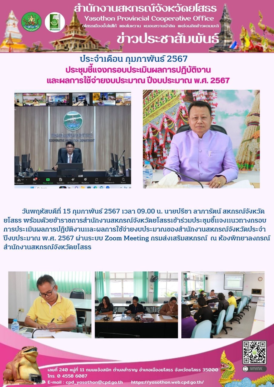 นายปรีชา ลาภารัตน์ สหกรณ์จังหวัดยโสธร พร้อมด้วยเจ้าหน้าที่สำนักงานสหกรณ์จังหวัดยโสธร เข้าร่วมประชุมชี้แจงแนวทางกรอบการประเมินผลการปฏิบัติงานและผลการใช้จ่ายงบประมาณของสำนักงานสหกรณ์จังหวัด ปีงบประมาณ พ.ศ.2567 ผ่านระบบ Zoom Meetting