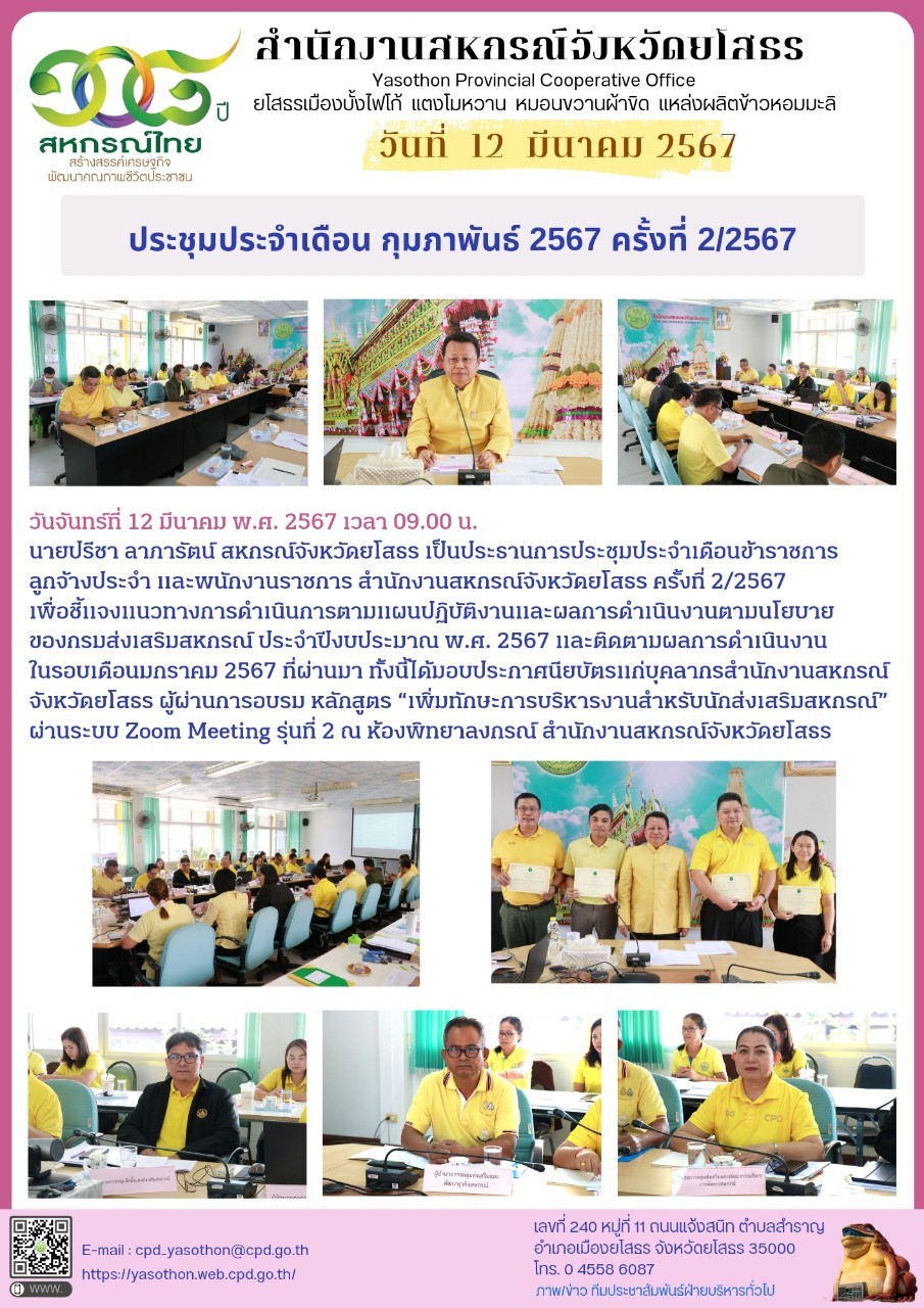 นายปรีชา ลาภารัตน์ สหกรณ์จังหวัดยโสธร เป็นประธานการประชุมประจำเดือนข้าราชการ ลูกจ้างประจำ และพนักงานราชการ ครั้งที่ 2/2567 ณ ห้องพิทยาลงกรณ์ สำนักงานสหกรณ์จังหวัดยโสธร