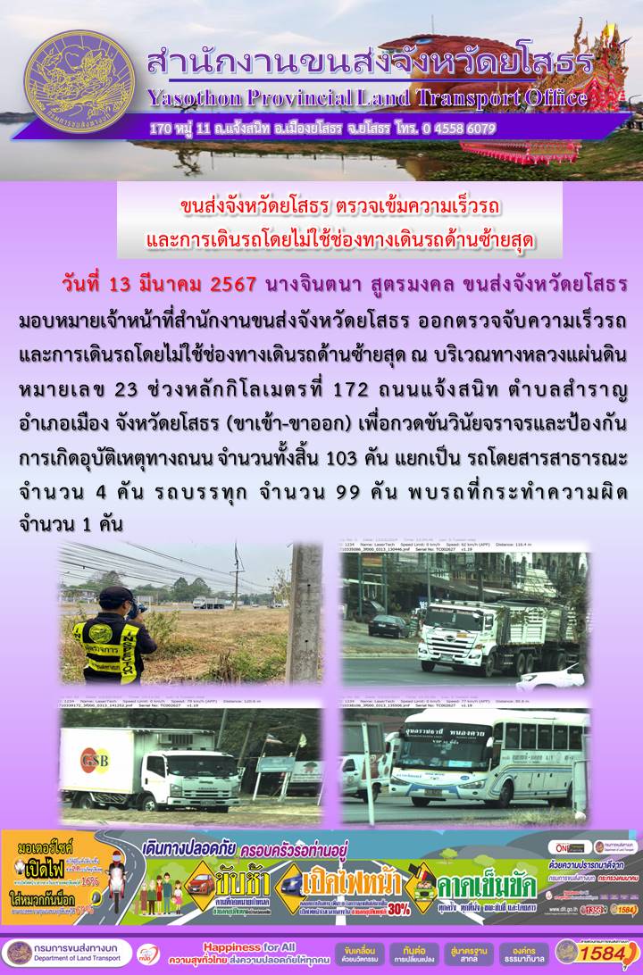 วันที่ 13 มีนาคม 2567 เจ้าหน้าที่สำนักงานขนส่งจังหวัดยโสธร ออกตั้งจุดตรวจจับความเร็ว