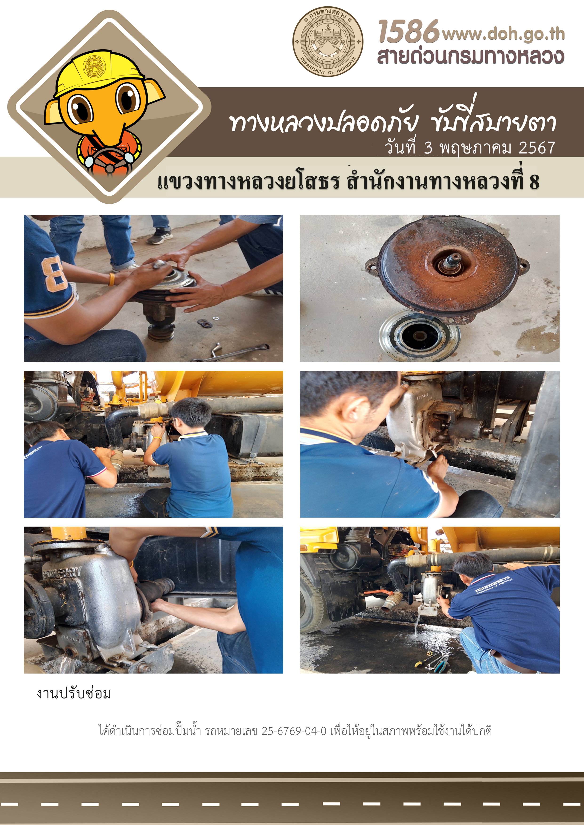 วันที่ 3 พฤษภาคม 2567 งานปรับซ่อม ได้ดำเนินการซ่อมปั๊มน้ำ รถหมายเลข 25-6769-04-0 เพื่อให้อยู่ในสภาพพร้อมใช้งานได้ปกติ