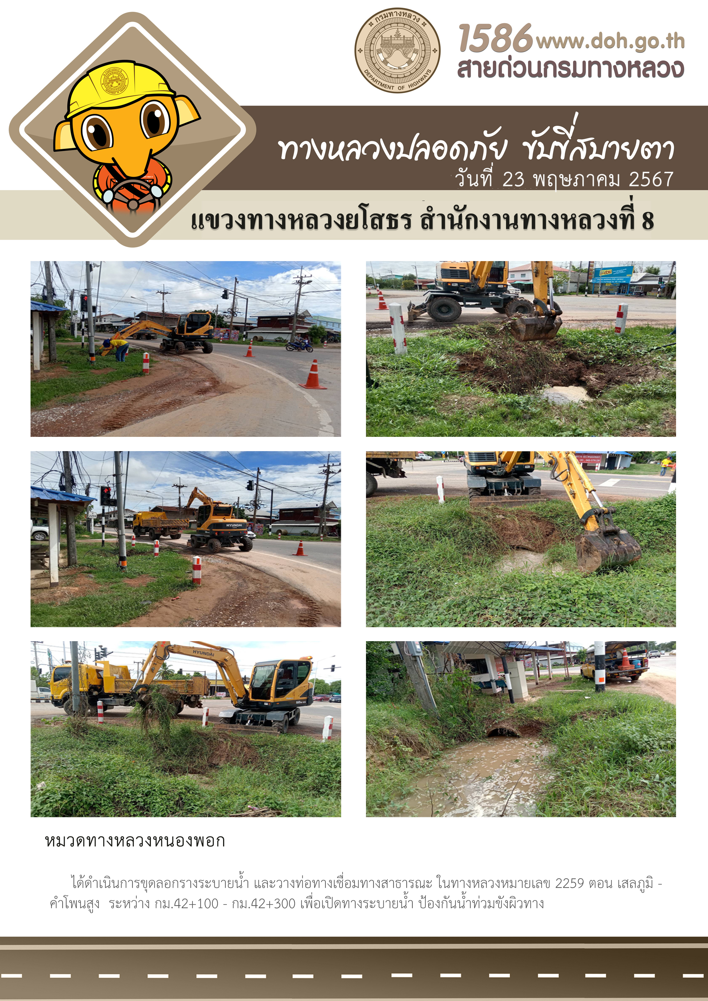 วันที่ 23 พฤษภาคม 2567 หมวดทางหลวงหนองพอก ได้ดำเนินการขุดลอกรางระบายน้ำ และวางท่อทางเชื่อมทางสาธารณะ ในทางหลวงหมายเลข 2259 ตอน เสลภูมิ - คำโพนสูง ระหว่าง กม.42+100 - กม.42+300 เพื่อเปิดทางระบายน้ำ ป้องกันน้ำท่วมขังผิวทาง