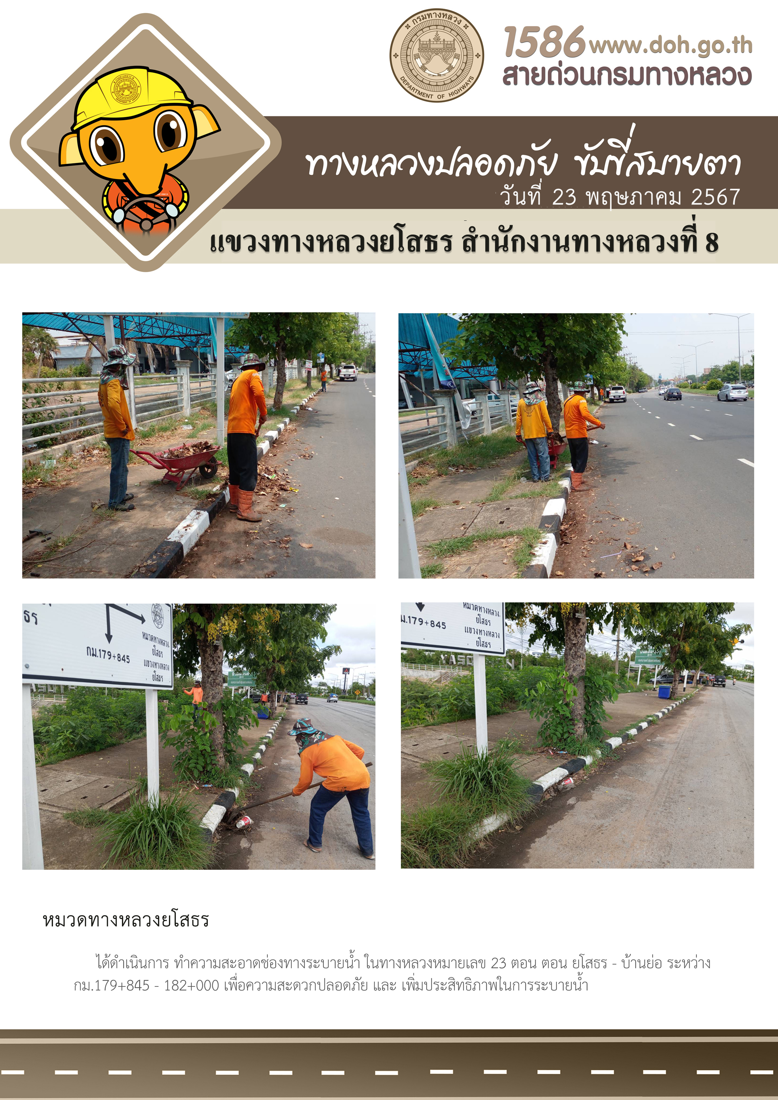 วันที่ 23 พฤษภาคม 2567 หมวดทางหลวงยโสธร ได้ดำเนินการทำความสะอาดช่องทางระบายน้ำ ในทางหลวงหมายเลข 23 ตอน ตอน ยโสธร - บ้านย่อ ระหว่าง กม.179+845 - 182+000 เพื่อความสะวกปลอดภัย และเพิ่มประสิทธิภาพในการระบายน้ำ