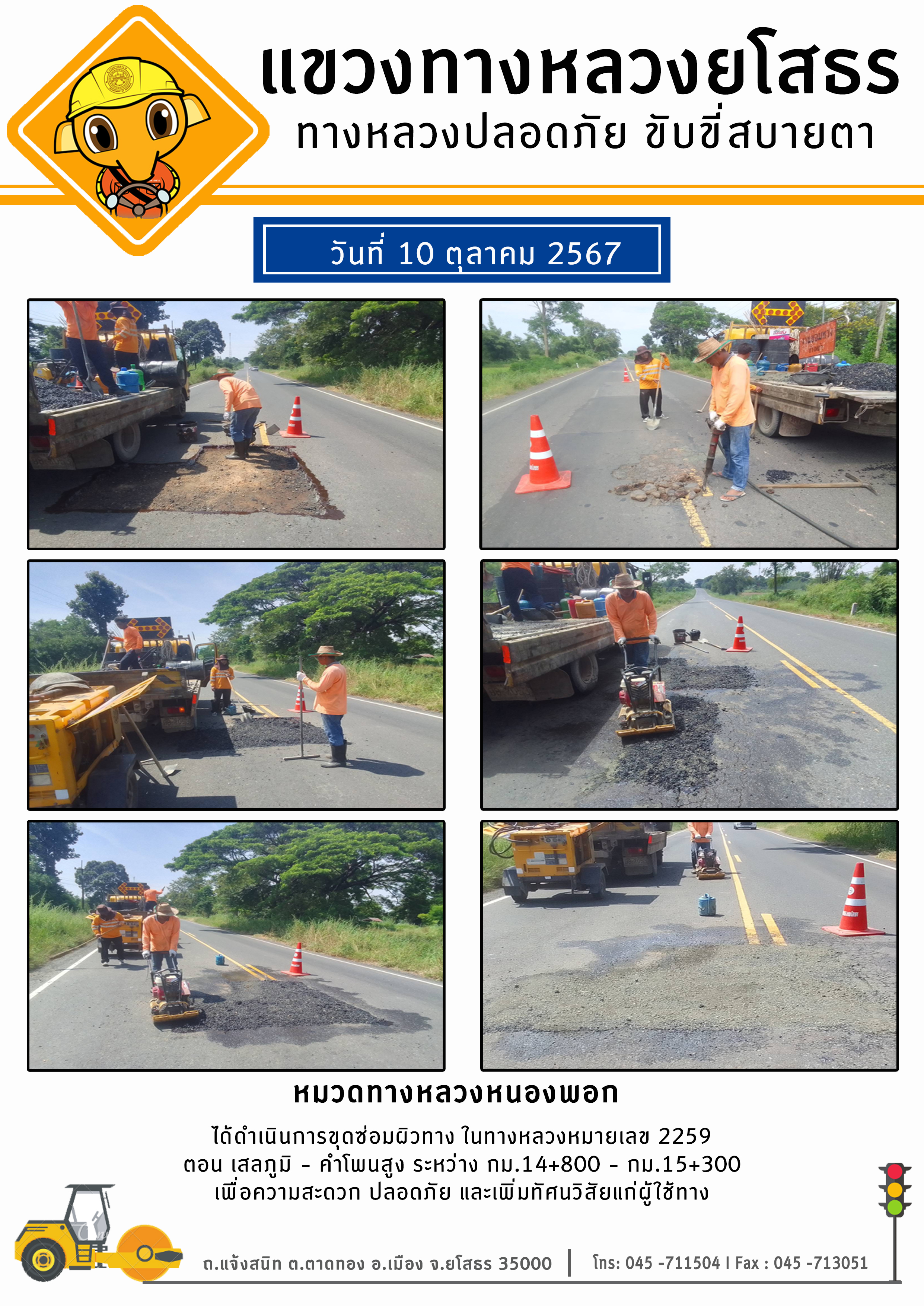วันที่ 10 ตุลาคม 2567 หมวดทางหลวงหนองพอก ได้ดำเนินการขุดซ่อมผิวทาง ในทางหลวงหมายเลข 2259 ตอน เสลภูมิ - คำโพนสูง ระหว่าง กม.14+800 - กม.15+300 เพื่อความสะดวก ปลอดภัย และเพิ่มทัศนวิสัยแก่ผู้ใช้ทาง