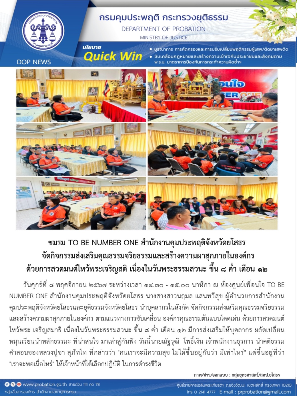 ชมรม TO BE NUMBER ONE สำนักงานคุมประพฤติจังหวัดยโสธร จัดกิจกรรมส่งเสริมคุณธรรมจริยธรรมและสร้างความผาสุกภายในองค์กร ด้วยการสวดมนต์ไหว้พระเจริญสติ เนื่องในวันพระธรรมสวนะ ขึ้น ๘ ค่ำ เดือน ๑๒