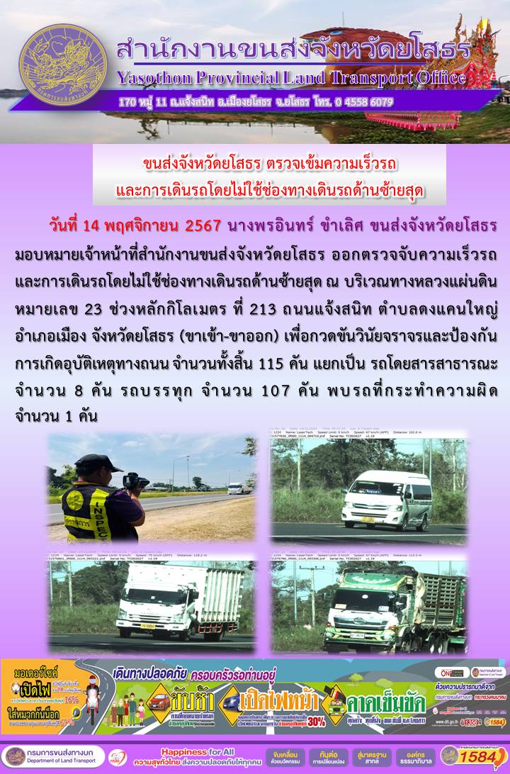 วันที่ 14 พฤศจิกายน 2567 เจ้าหน้าที่สำนักงานขนส่งจังหวัดยโสธร ออกตั้งจุดตรวจจับความเร็ว
