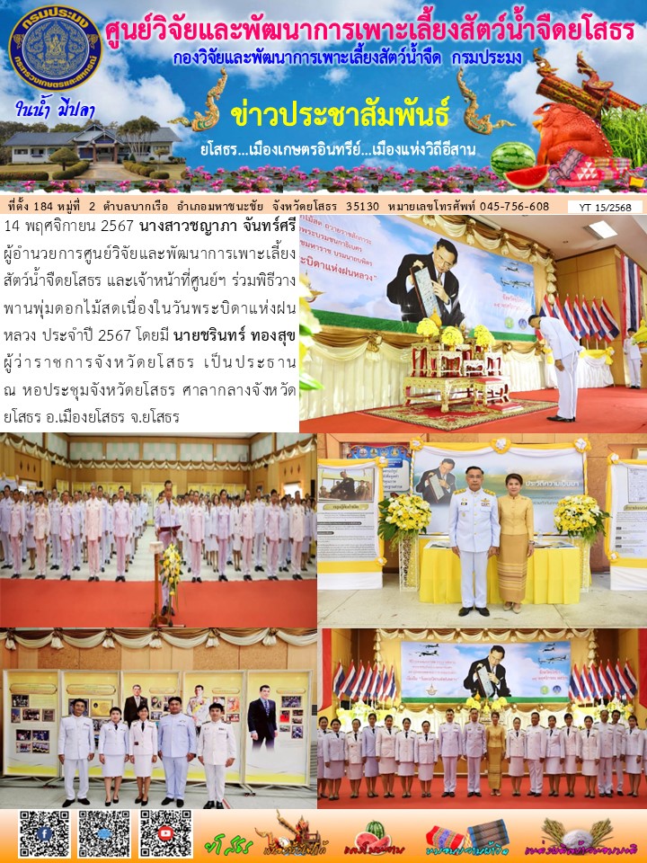 นางสาวชญาภา จันทร์ศรี ผู้อำนวยการศูนย์วิจัยและพัฒนาการเพาะเลี้ยงสัตว์น้ำจืดยโสธร และเจ้าหน้าที่ศูนย์ฯ ร่วมพิธีวางพานพุ่มดอกไม้สดเนื่องในวันพระบิดาแห่งฝนหลวง ประจำปี 2567