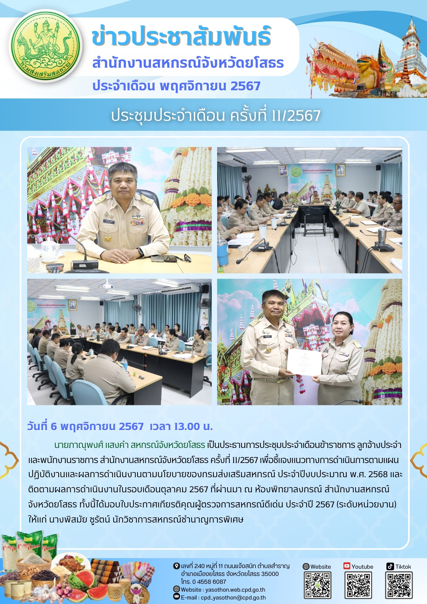 นายภาณุพงศ์ แสงคำ สหกรณ์จังหวัดยโสธร เป็นประธานการประชุมประจำเดือนข้าราชการ ลูกจ้างประจำและพนักงานราชการ สำนักงานสหกรณ์จังหวัดยโสธร ครั้งที่ 11/2567 ณ ห้องพิทยาลงกรณ์ สำนักงานสหกรณ์จังหวัดยโสธร