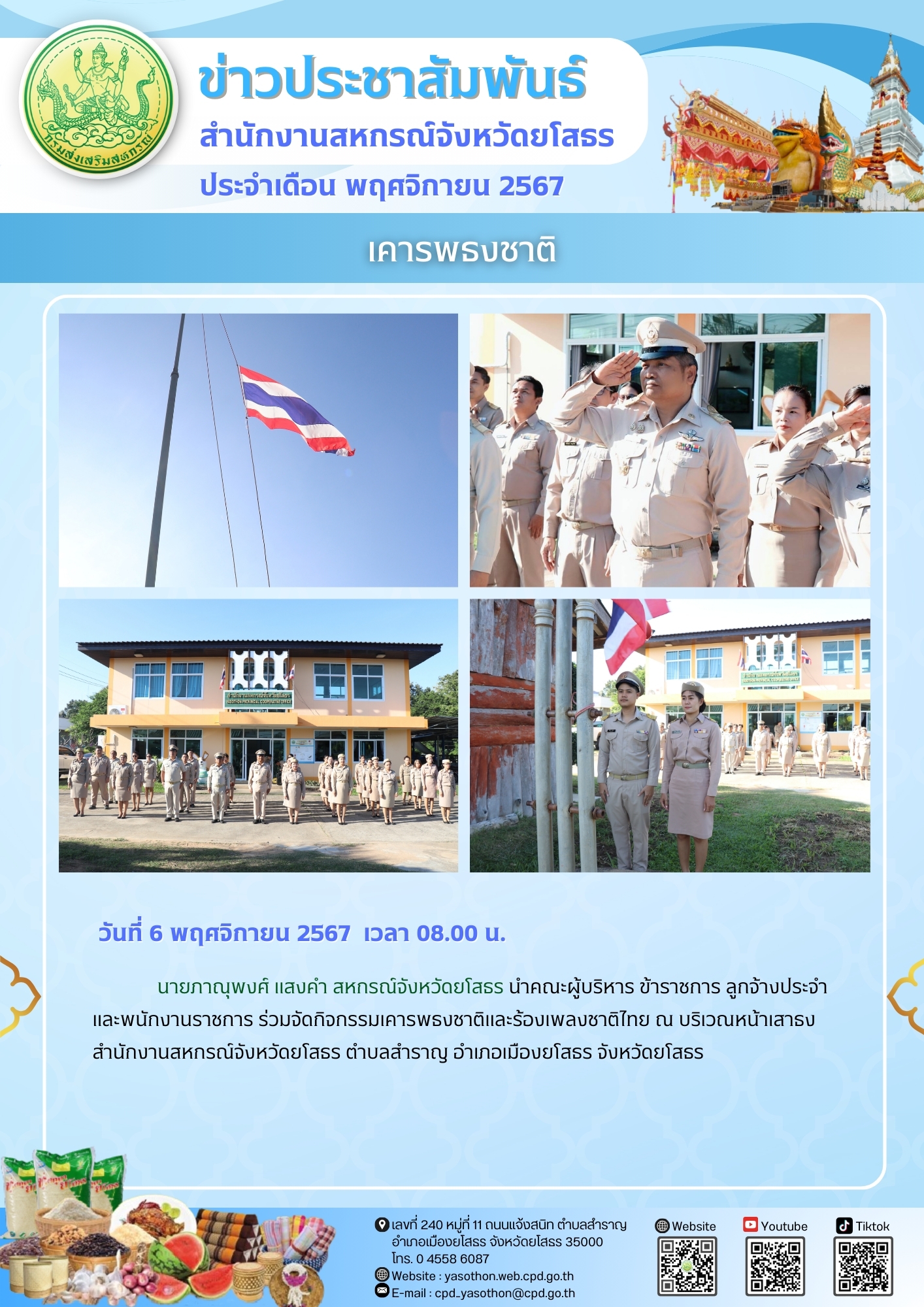 นายภาณุพงศ์ แสงคำ สหกรณ์จังหวัดยโสธร นำคณะผู้บริหาร ข้าราชการ ลูกจ้างประจำ และพนักงานราชการ ร่วมจัดกิจกรรมเคารพธงชาติและร้องเพลงชาติไทย ณ บริเวณหน้าเสาธง สำนักงานสหกรณ์จังหวัดยโสธร