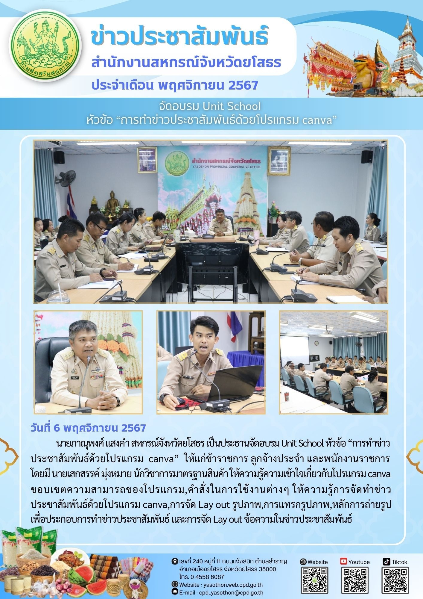 นายภาณุพงศ์ แสงคำ สหกรณ์จังหวัดยโสธร เป็นประธานจัดอบรม Unit School หัวข้อ "การทำข่าวประชาสัมพันธ์ด้วยโปรแกรม Canva" ให้แก่ข้าราชการ ลูกจ้างประจำ และพนักงานราชการ