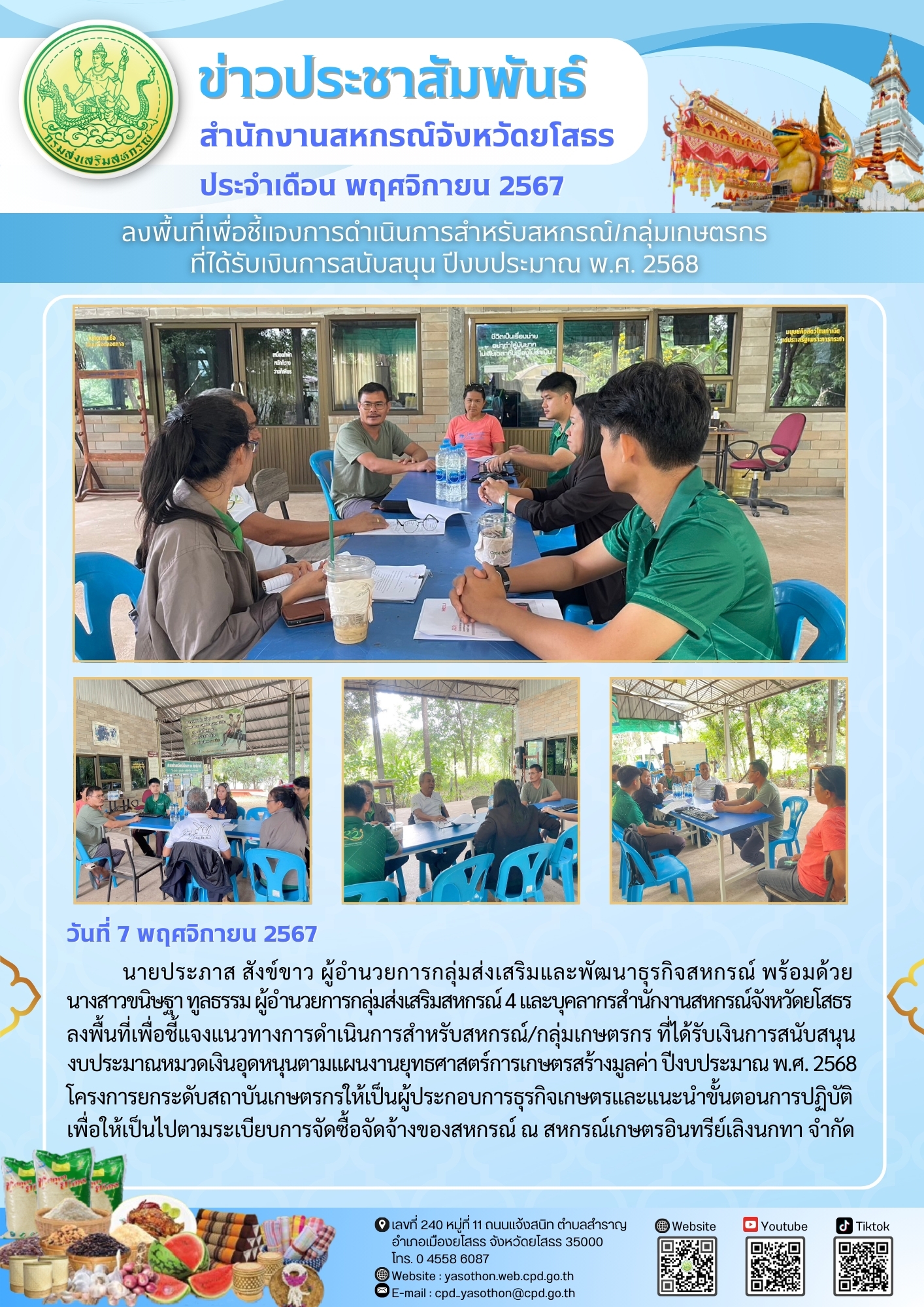 นายประภาส สังข์ขาว ผู้อำนวยการกลุ่มส่งเสริมและพัฒนาธุรกิจสหกรณ์ พร้อมด้วยนางสาวขนิษฐา ทูลธรรม ผู้อำนวยการกลุ่มส่งเสริมสหกรณ์ 4 และบุคลากรสำนักงานสหกรณ์จังหวัดยโสธร ลงพื้นที่เพื่อชี้แจงแนวทางการดำเนินการสำหรับสหกรณ์/กลุ่มเกษตรกรที่ไดัรับการสนับสนุน