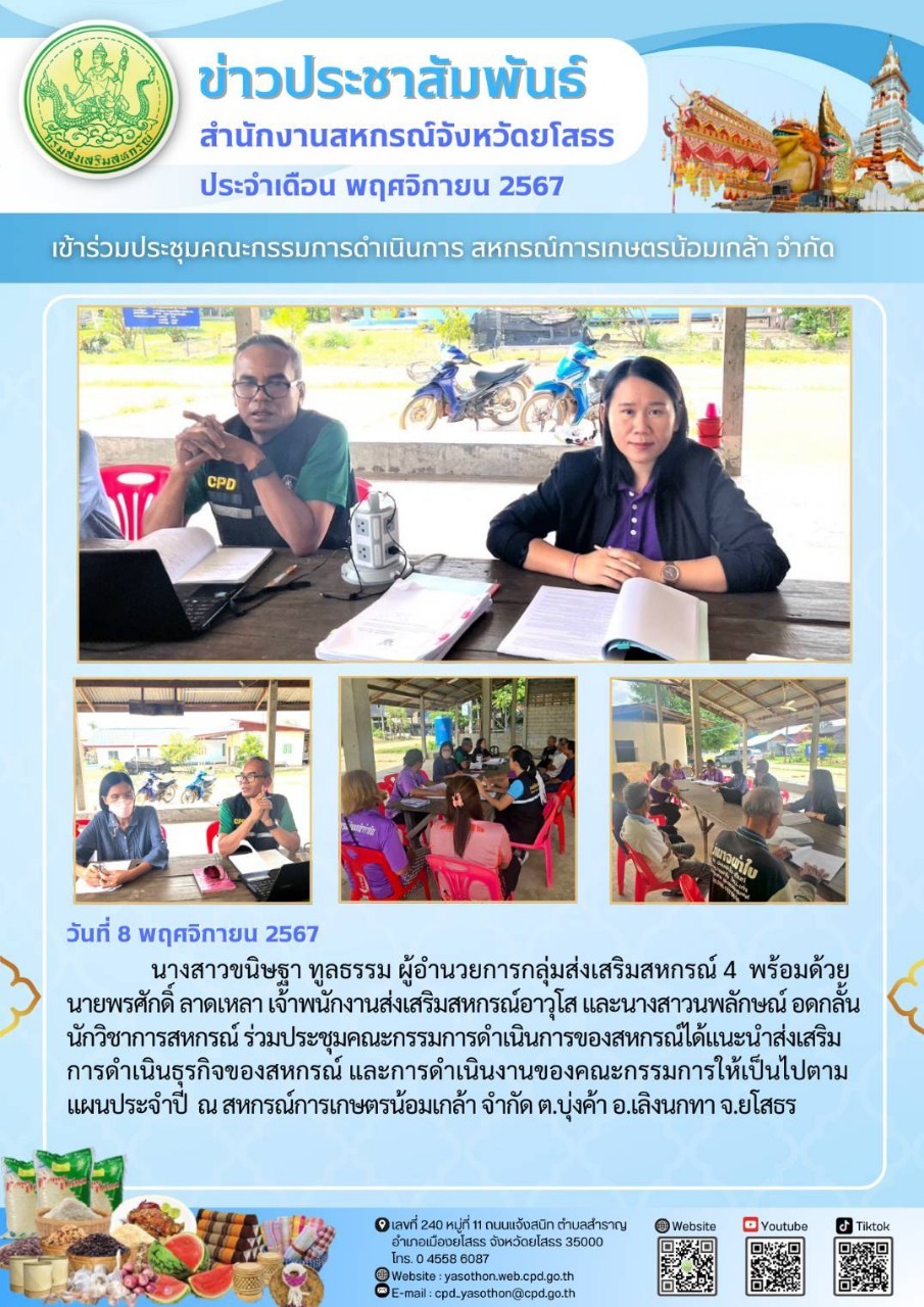 นางสาวขนิษฐา ทูลธรรม ผู้อำนวยการกลุ่มส่งเสริมสหกรณ์ 4 พร้อมด้วยเจ้าหน้าที่สำนักงานสหกรณ์จังหวัดยโสธรร่วมประชุมคณะกรรมการดำเนินการของสหกรณ์ได้แนะนำส่งเสริมการดำเนินธุรกิจสหกรณ์ ณ สหกรณ์การเกษตรน้อมเกล้า จำกัด