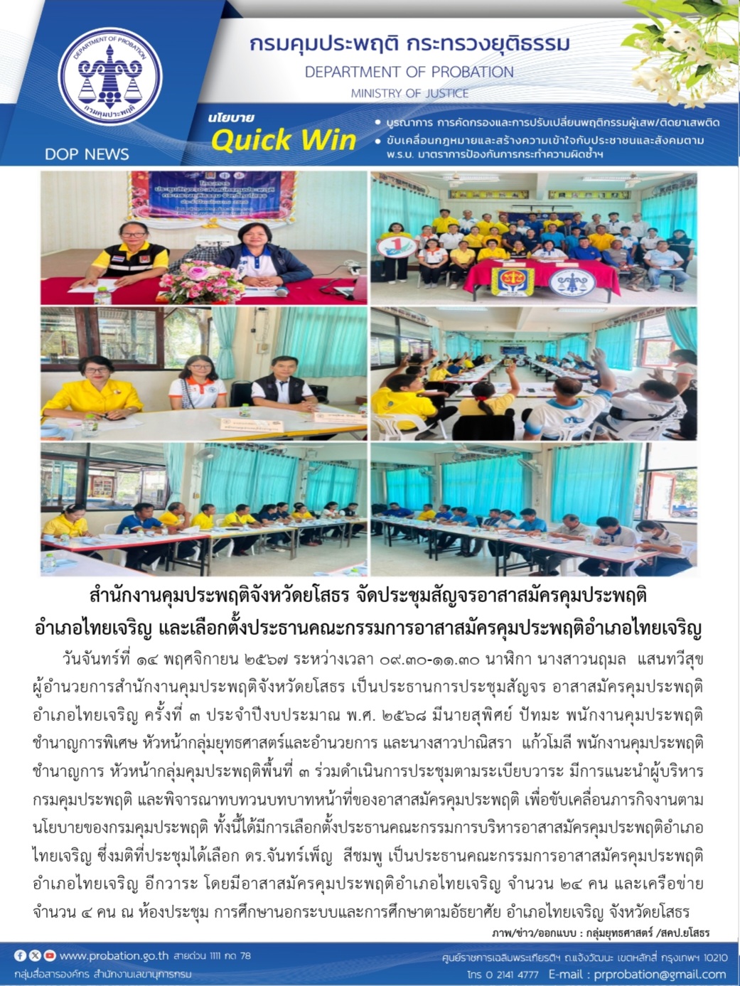 วันที่ 19 พ.ย. 2567 (10:10 น.)วันที่ ๑๔ พฤศจิกายน ๒๕๖๗ ระหว่างเวลา ๐๙.๓๐-๑๑.๓๐ นาฬิกา นางสาวนฤมล แสนทวีสุข ผู้อำนวยการสำนักงานคุมประพฤติจังหวัดยโสธร เป็นประธานการประชุมสัญจร อาสาสมัครคุมประพฤติอำเภอไทยเจริญ ครั้งที่ ๓ ประจำปีงบประมาณ พ.ศ. ๒๕๖๘ มีนายสุพิศย์ ปัทมะ พนักงานคุมประพฤติชำนาญการพิเศษ หัวหน้ากลุ่มยุทธศาสตร์และอำนวยการ และนางสาวปาณิสรา แก้วโมลี พนักงานคุมประพฤติชำนาญการ หัวหน้ากลุ่มคุมประพฤติพื้นที่ ๓ ร่วมดำเนินการประชุมตามระเบียบวาระ มีการแนะนำผู้บริหารกรมคุมประพฤติ และพิจารณาทบทวนบทบาทหน้าที่ของอาสาสมัครคุมประพฤติ เพื่อขับเคลื่อนภารกิจงานตามนโยบายของกรมคุมประพฤติ ทั้งนี้ได้มีการเลือกตั้งประธานคณะกรรมการบริหารอาสาสมัครคุมประพฤติอำเภอไทยเจริญ ซึ่งมติที่ประชุมได้เลือก ดร.จันทร์เพ็ญ สีชมพู เป็นประธานคณะกรรมการอาสาสมัครคุมประพฤติอำเภอไทยเจริญ อีกวาระ โดยมีอาสาสมัครคุมประพฤติอำเภอไทยเจริญ จำนวน ๒๔ คน และเครือข่าย จำนวน ๔ คน ณ ห้องประชุม การศึกษานอกระบบและการศึกษาตามอัธยาศัย อำเภอไทยเจริญ จังหวัดยโสธร