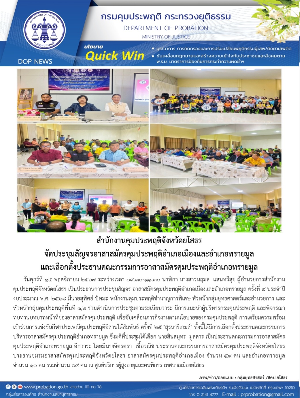วันที่ 19 พ.ย. 2567 (10:12 น.)วันศุกร์ที่ ๑๕ พฤศจิกายน ๒๕๖๗ ระหว่างเวลา ๐๙.๓๐-๑๑.๓๐ นาฬิกา นางสาวนฤมล แสนทวีสุข ผู้อำนวยการสำนักงานคุมประพฤติจังหวัดยโสธร เป็นประธานการประชุมสัญจร อาสาสมัครคุมประพฤติอำเภอเมืองและอำเภอทรายมูล ครั้งที่ ๔ ประจำปีงบประมาณ พ.ศ. ๒๕๖๘ มีนายสุพิศย์ ปัทมะ พนักงานคุมประพฤติชำนาญการพิเศษ หัวหน้ากลุ่มยุทธศาสตร์และอำนวยการ และหัวหน้ากลุ่มคุมประพฤติพื้นที่ ๑,๒ ร่วมดำเนินการประชุมตามระเบียบวาระ มีการแนะนำผู้บริหารกรมคุมประพฤติ และพิจารณาทบทวนบทบาทหน้าที่ของอาสาสมัครคุมประพฤติ เพื่อขับเคลื่อนภารกิจงานตามนโยบายของกรมคุมประพฤติ การเตรียมความพร้อมเข้าร่วมการแข่งขันกีฬาประเพณีคุมประพฤติอิสานใต้สัมพันธ์ ครั้งที่ ๒๕ "สุรนารีเกมส์" ทั้งนี้ได้มีการเลือกตั้งประธานคณะกรรมการบริหารอาสาสมัครคุมประพฤติอำเภอทรายมูล ซึ่งมติที่ประชุมได้เลือก นายสินสมุทร มูลสาร เป็นประธานคณะกรรมการอาสาสมัครคุมประพฤติอำเภอทรายมูล อีกวาระ โดยมีนางจิตรตรา เชื้อวณิช ประธานคณะกรรมการอาสาสมัครคุมประพฤติจังหวัดยโสธร ประธานชมรมอาสาสมัครคุมประพฤติจังหวัดยโสธร อาสาสมัครคุมประพฤติอำเภอเมือง จำนวน ๕๙ คน และอำเภอทรายมูล จำนวน ๑๐ คน รวมจำนวน ๖๙ คน ณ ศูนย์บริการผู้สูงอายุและคนพิการ เทศบาลเมืองยโสธร