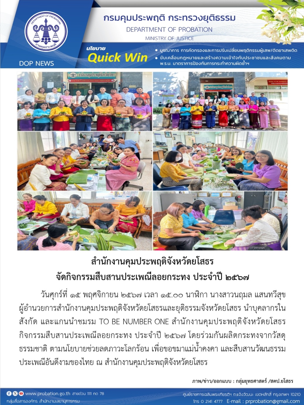 สำนักงานคุมประพฤติจังหวัดยโสธร จัดกิจกรรมสืบสานประเพณีลอยกระทง ประจำปี ๒๕๖๗