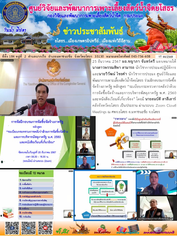 นางสาวพรรณทิพา สามารถ นักวิชาการประมงปฏิบัติการ และนายวิวัฒน์ ไชยคำ นักวิชาการประมง ศพจ.ยโสธร ร่วมฝึกอบรมการจัดซื้อจัดจ้างภาครัฐ หลักสูตร “ระเบียบกระทรวงการคลังว่าด้วยการจัดซื้อจัดจ้างและการบริหารพัสดุภาครัฐ พ.ศ. 2560 และหนังสือเวียนที่เกี่ยวข้อง”